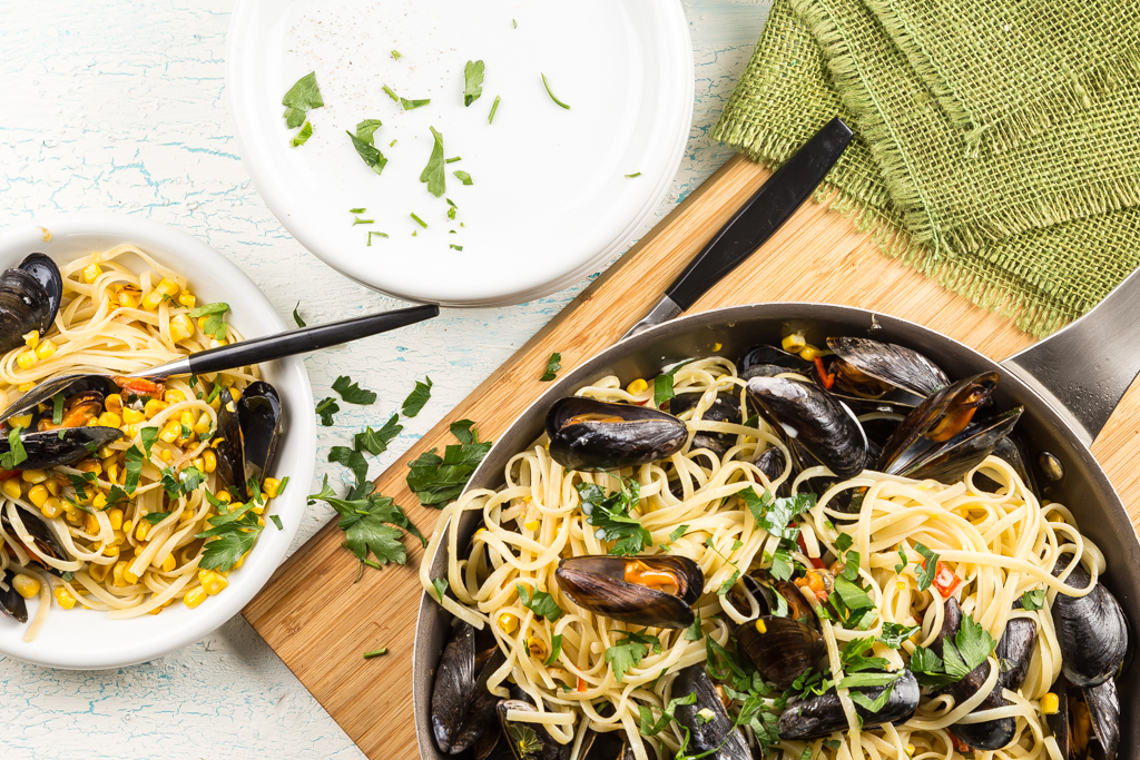 - Häll av pastan men spara cirka 1 dl av kokvattnet. Blanda med musslor, spad, majs och persilja i grytan och låt koka ihop någon minut.