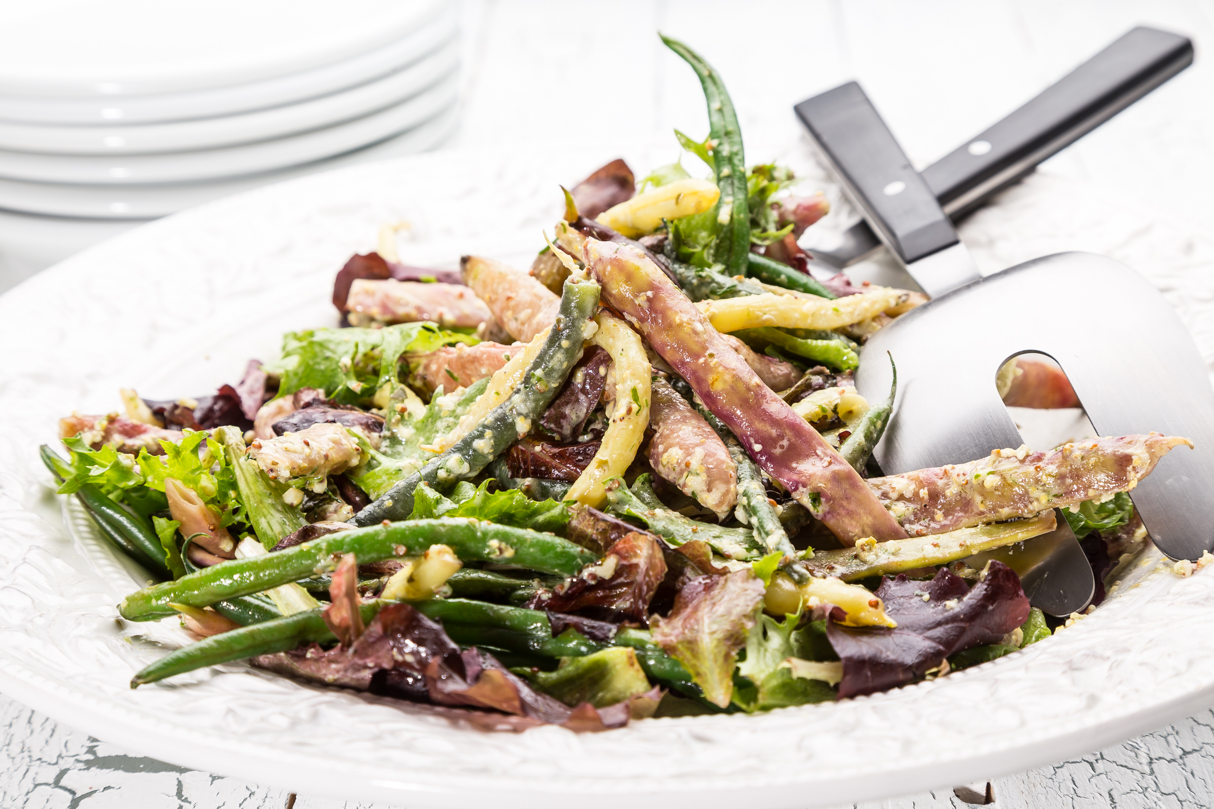 Koka bönorna al dente i vatten. Häll av vattnet och vänd ner bönorna i dressingen. Blanda ner salladsbladen och servera med lite bröd.