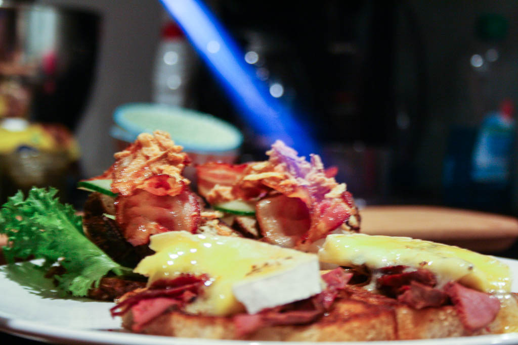 Sen slutligen på en skiva grovt rågbröd var det hemmagjord leverpastej som fanns i frysen, syltlök, lite grönt, bacon och rostad lök. Till detta (utanför bild) fanns picklade morötter, inlagd rödlök och syltad svamp. En bra kylskåpsrensning.