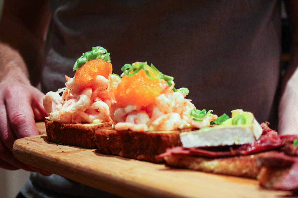 På den här plankan har vi överst färska räkor, löjrom, majonäs på ett smörstekt briochebröd (se nedan). Sen har vi rökt älg, en bit getost som brändes på, honung och en skiva stekt surdegsbröd.
