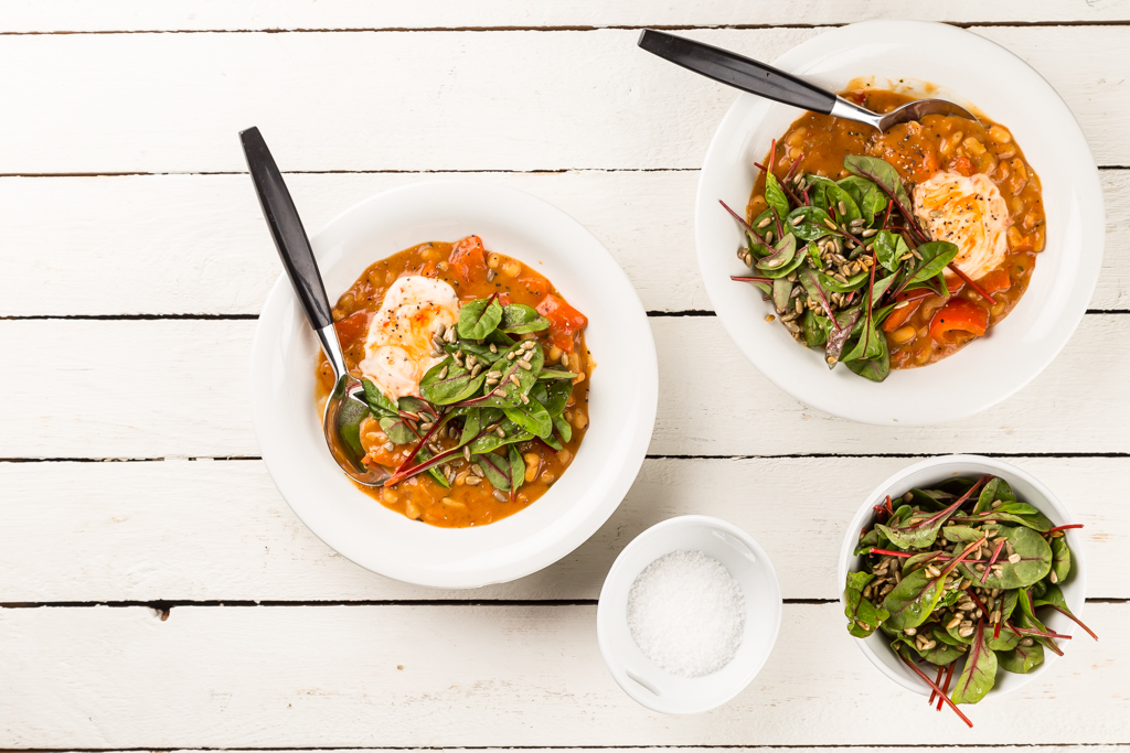 Smaka av och servera med gott bröd, något krämigt och gärna som här – en sallad med späd mangold och rostade sesamfrön.