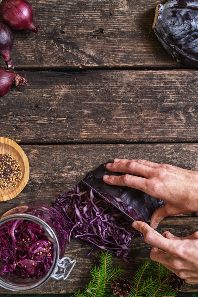 Mer rödkål till julbordet. Rödkålssallad med senap, vinäger och valnötter.