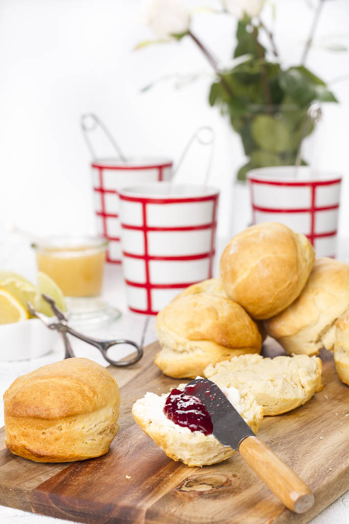 Nybakade engelska scones! Luftiga, smöriga och lite söta, serveras gärna med clotted cream och sylt till afternoon tea. De ska gärna vara höga snarare än breda – ett tips är att baka dem i muffinsplåt så växer de uppåt.