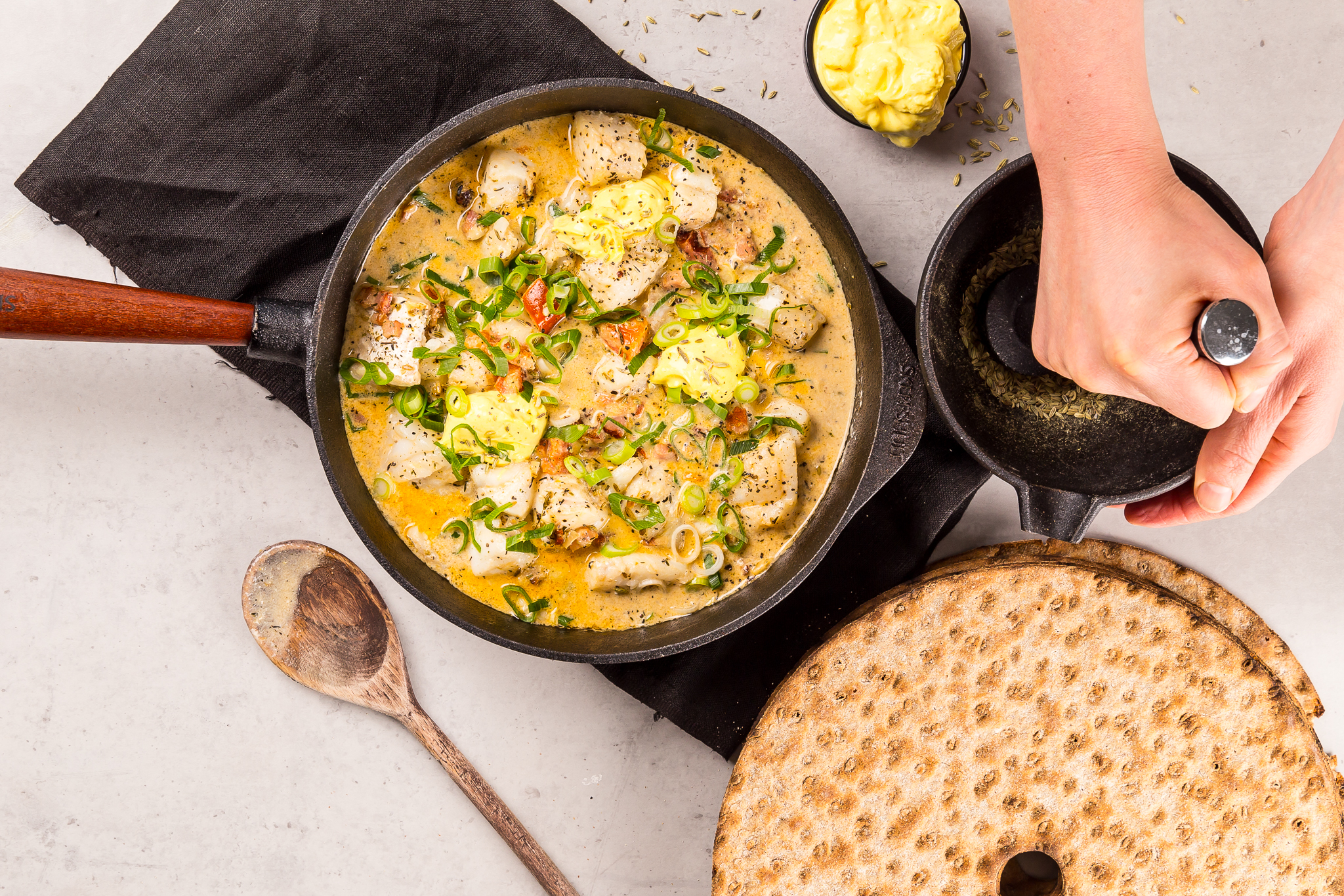 Vilken fisk ni väljer kan varieras, men till en fiskgryta som denna så passar det sig fint med några av alla våra goda matfiskar som inte är lax och torsk. Som kolja eller sej.