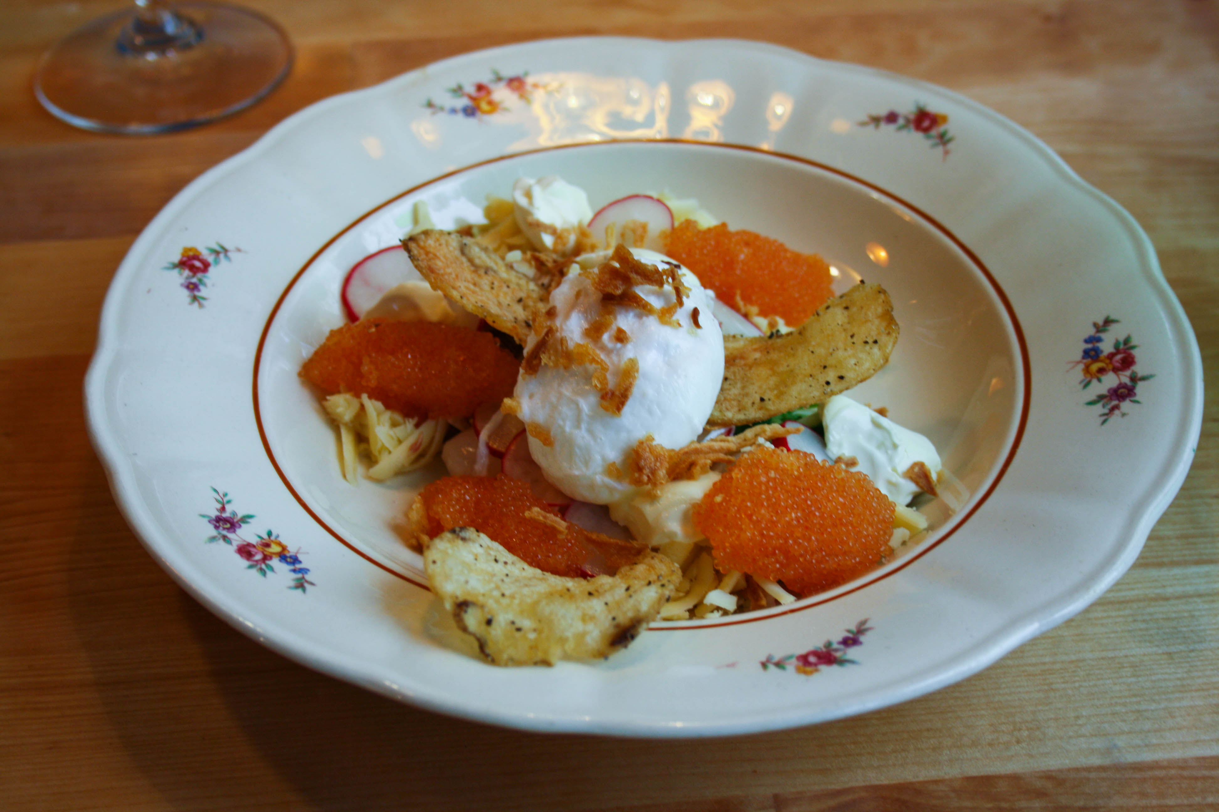 - krispiga grönsaker, här var det tunt skivade rädisor, sockerärtor och rödlök.