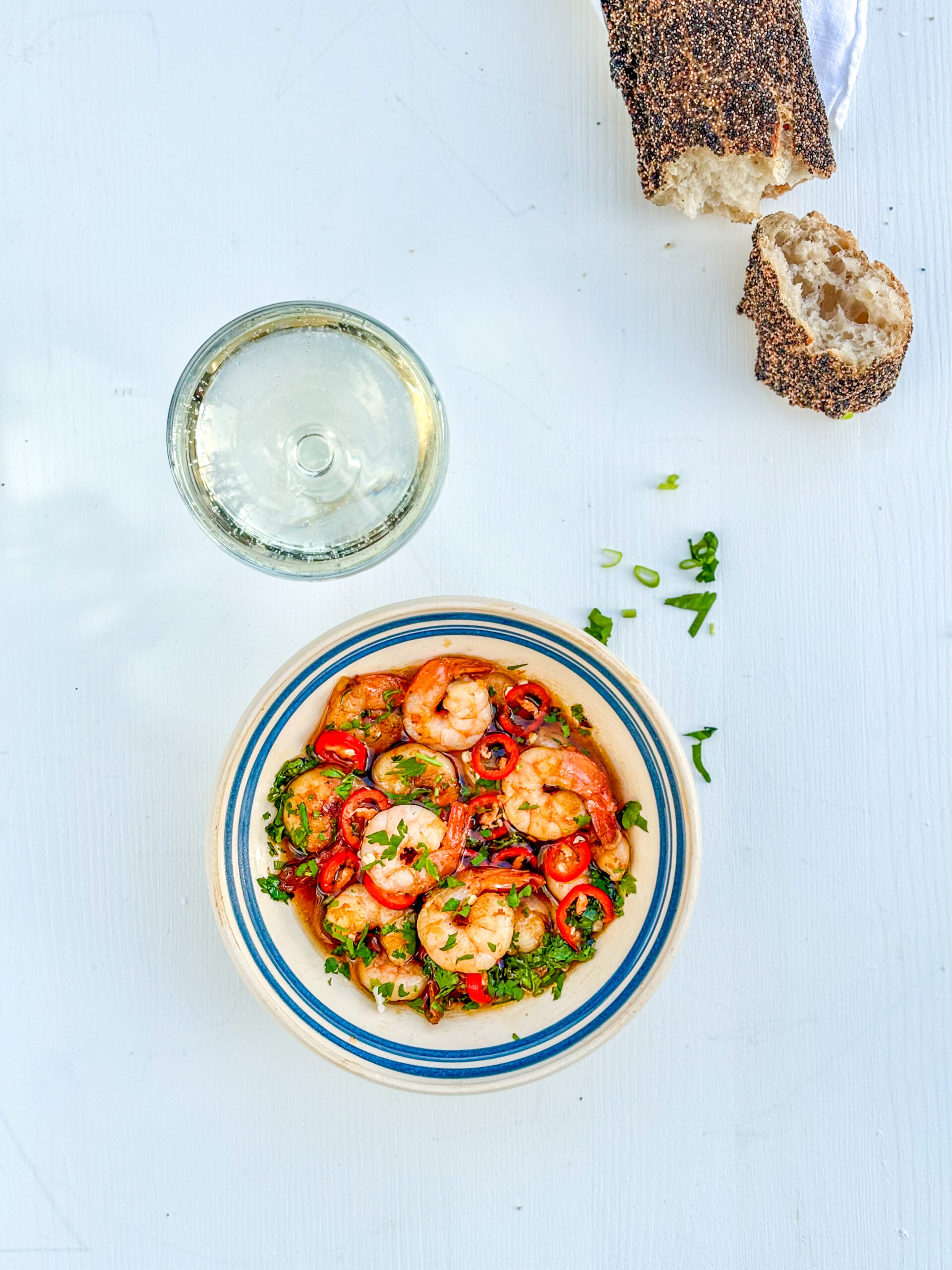 Tapasfavoriten räkor, vitlök, chili & olja ❤︎ Serveras gärna till ett glas cava och en bit bröd.