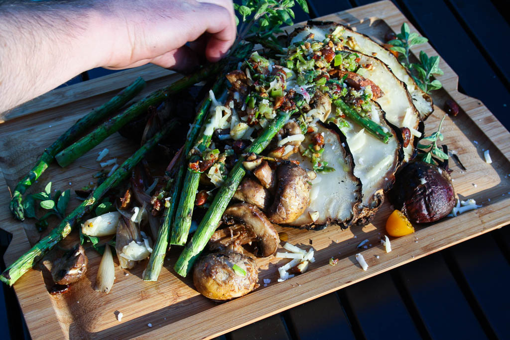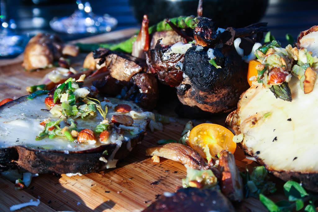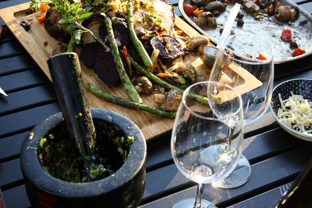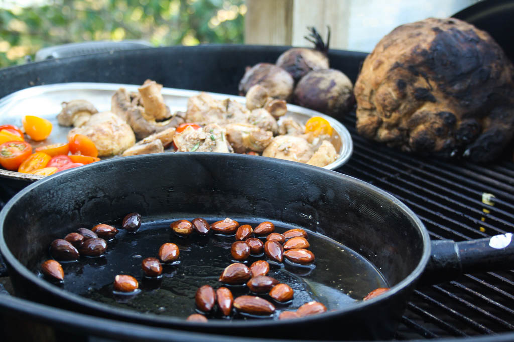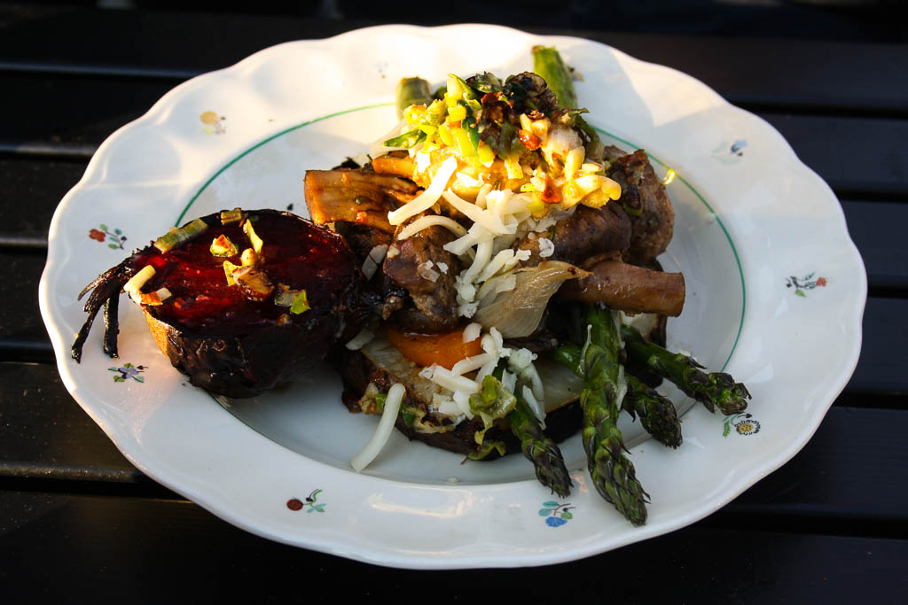Långgrillad rotselleri, lök och rödbetor. Mandelpesto på vårörter, sparris, grillade champinjoner med mandelsmör & rosmarin. Toppades med vällagrad ost, citronolja, flingsalt och grovhackad smörstekt mandel.