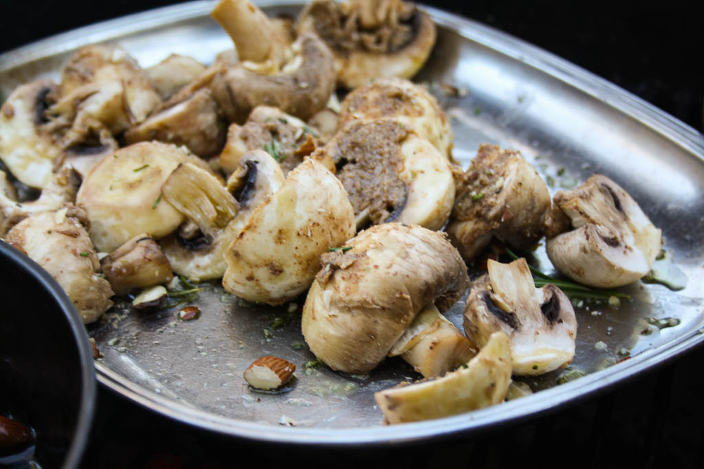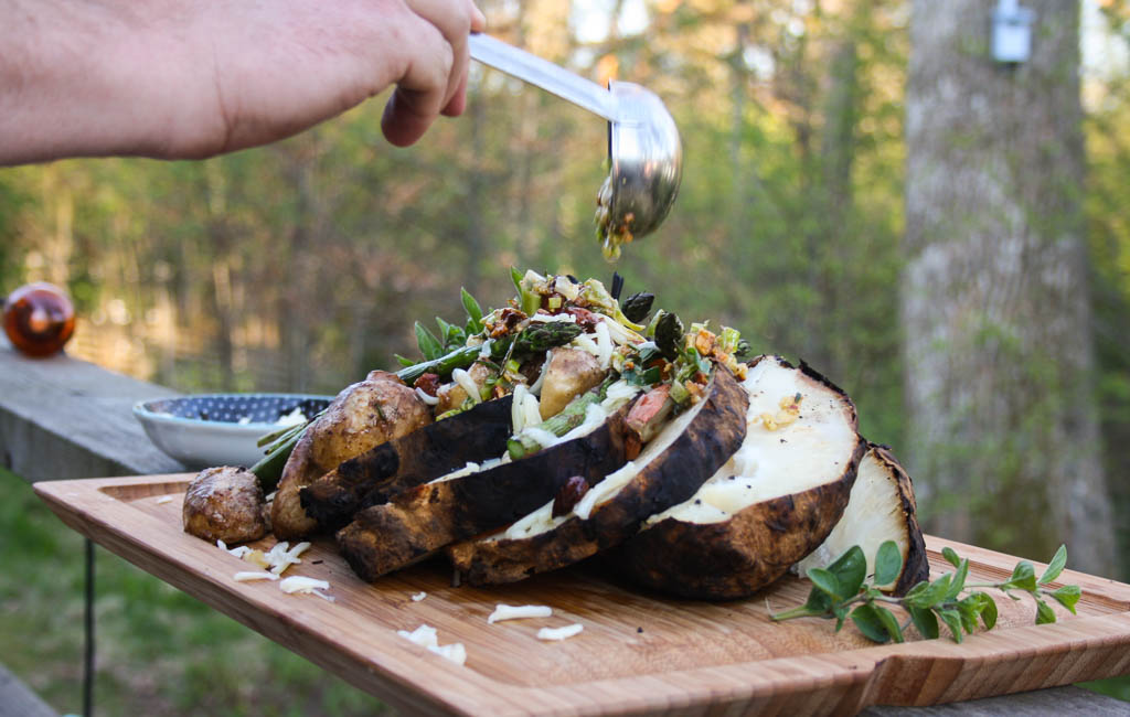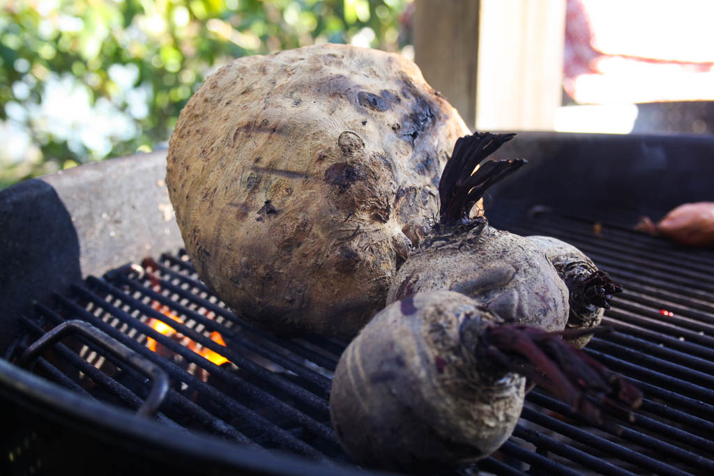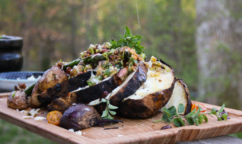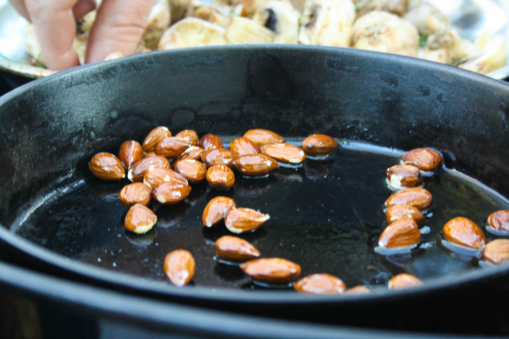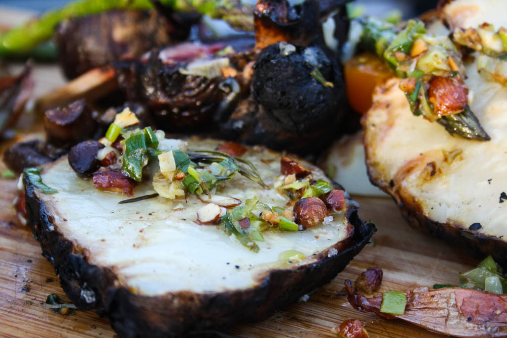 Långgrillad rotselleri, lök och rödbetor. Mandelpesto på vårörter, sparris, grillade champinjoner med mandelsmör & rosmarin. Toppades med vällagrad ost, citronolja, flingsalt och grovhackad smörstekt mandel.