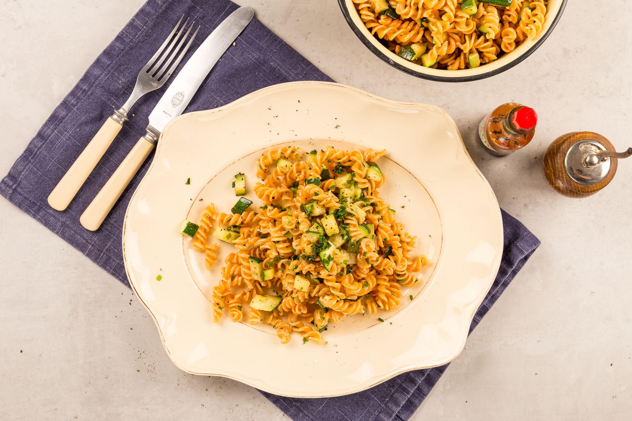 6. Häll av pastan och blanda ihop med zucchini och finriven parmesan.
