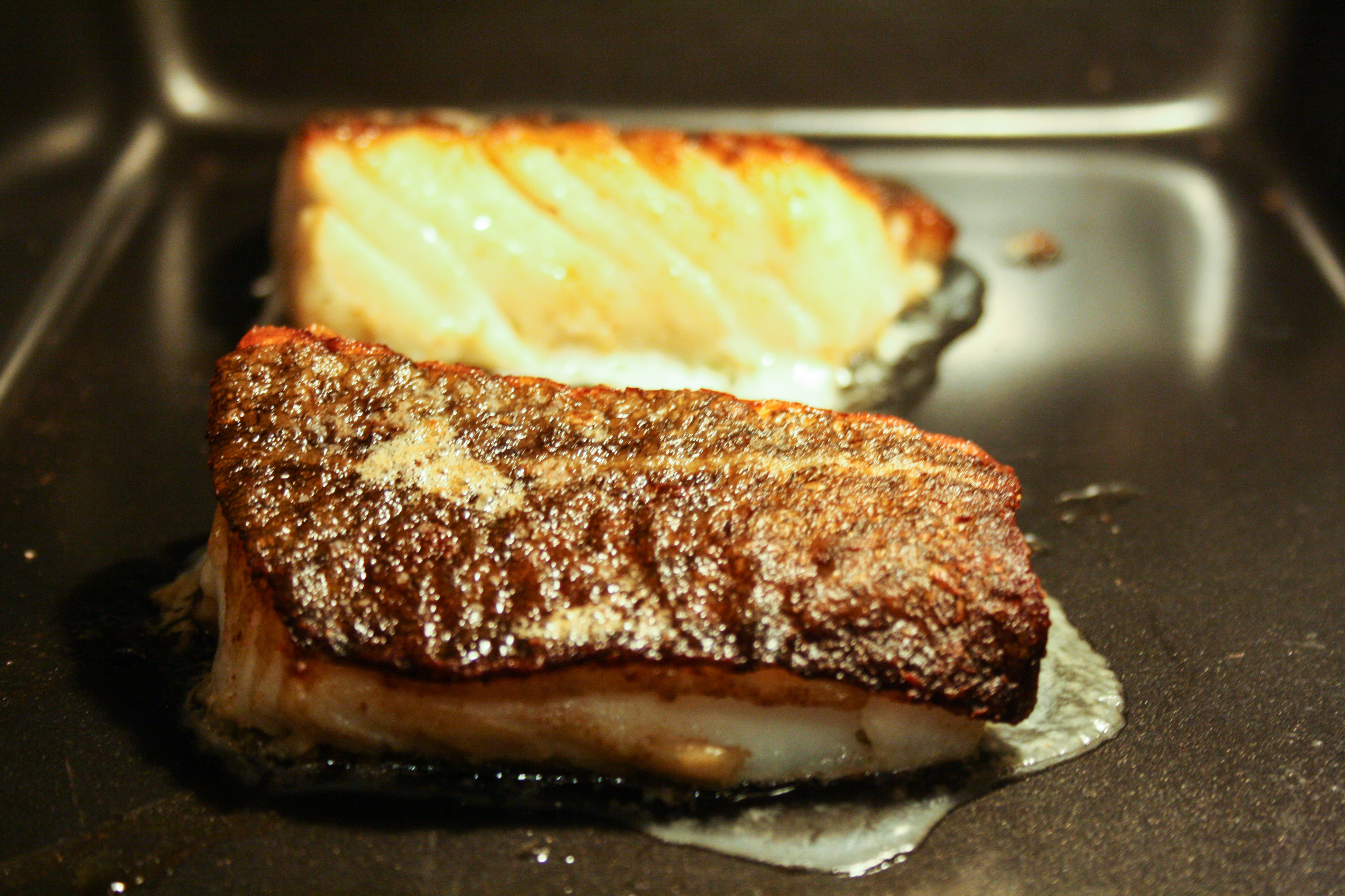 - Hetta upp smör i en panna tills det blir brunt. Lägg i fisken med skinnsidan ner och stek ganska hårt.