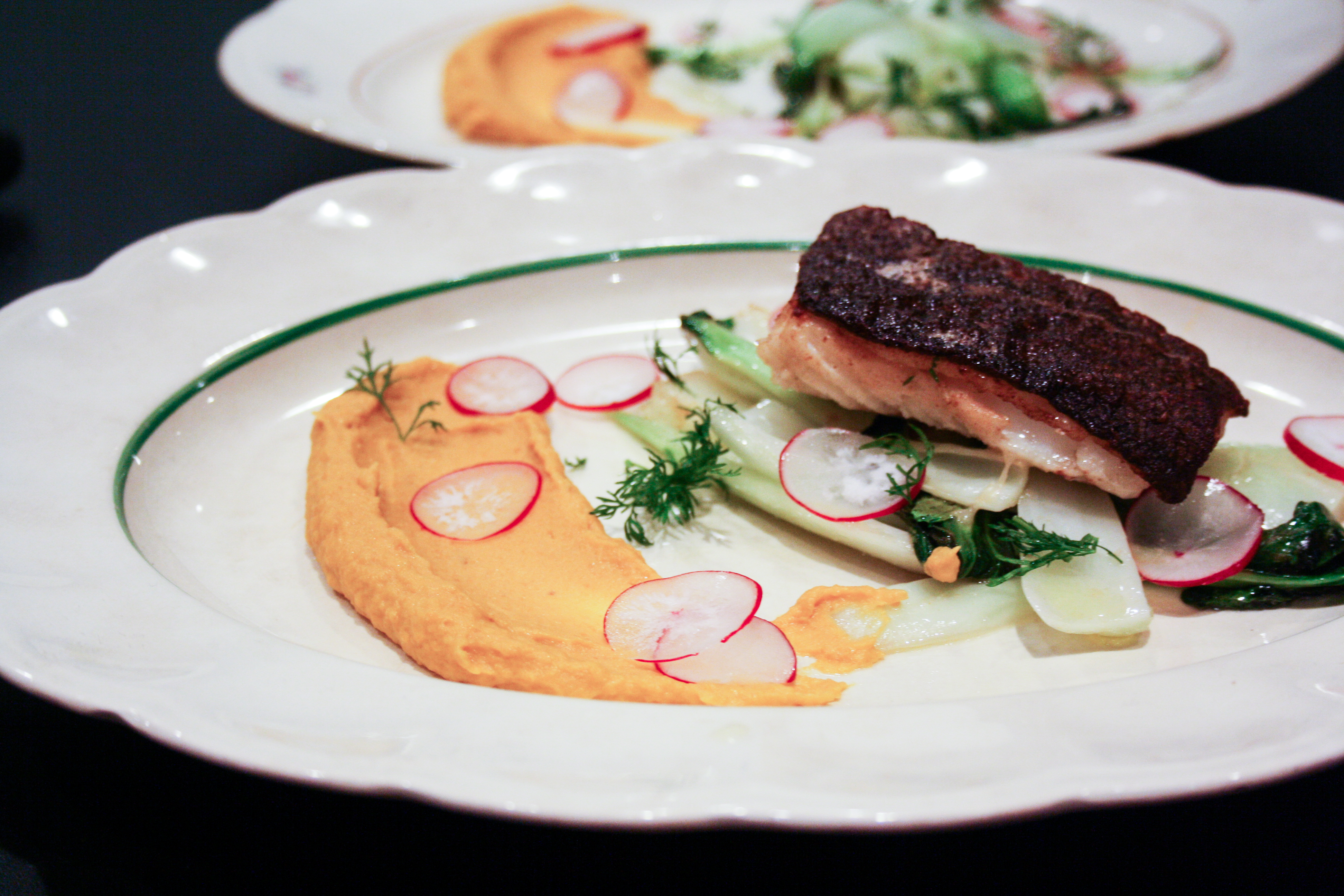 Här en fin bit Halstrad torskrygg med sötpotatiskräm, brynt smör, pak choi och hyvlade rädisor.