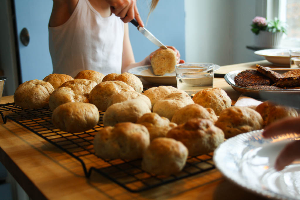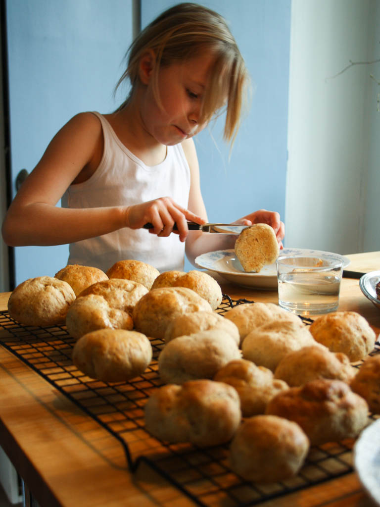 Barn som bakar – det är väl en trevlig barnvakt. Här bakar de både Havrebullar (glutenfria) och knådar vetemjölsdeg till Miniäppelbullar.