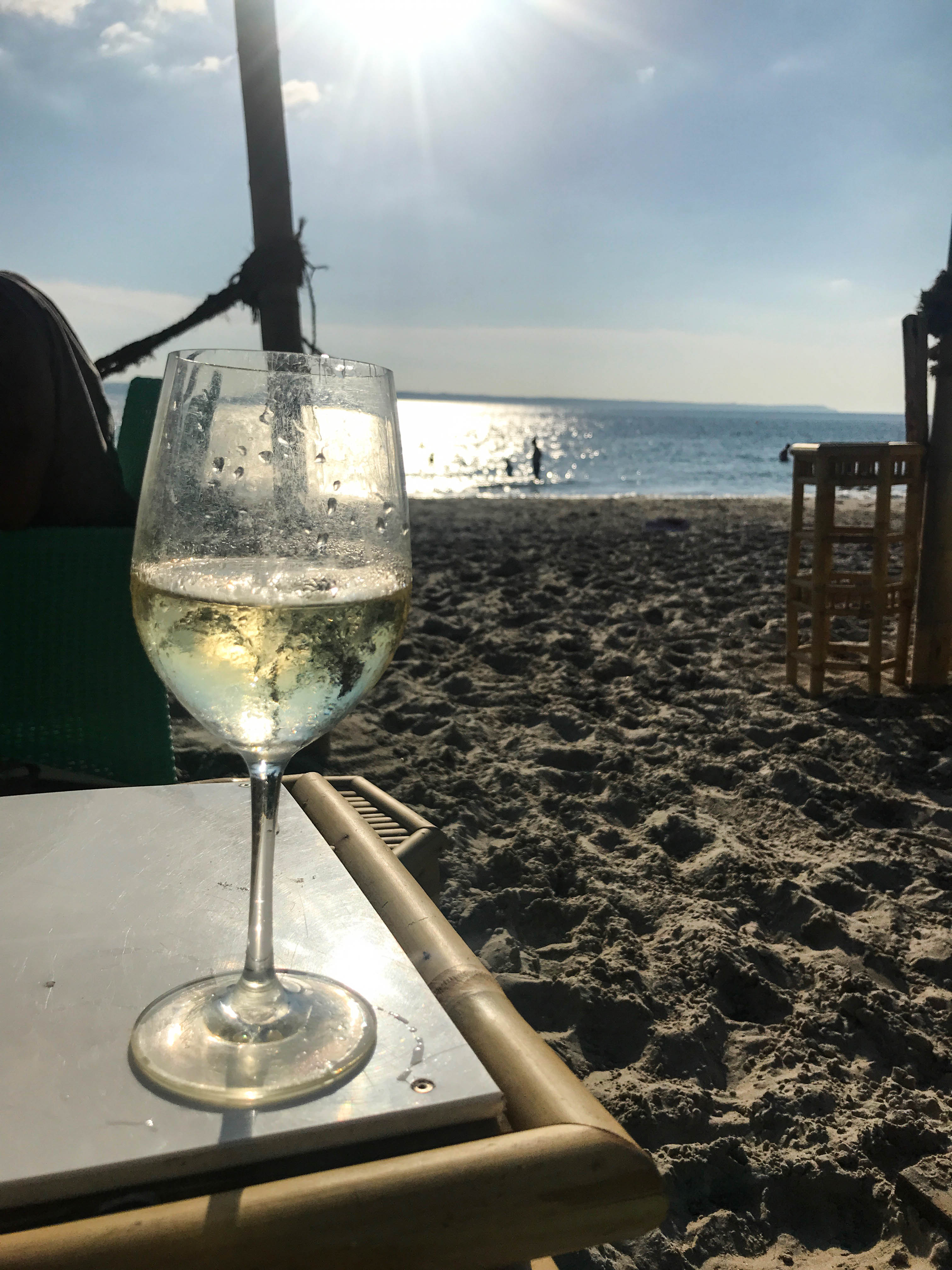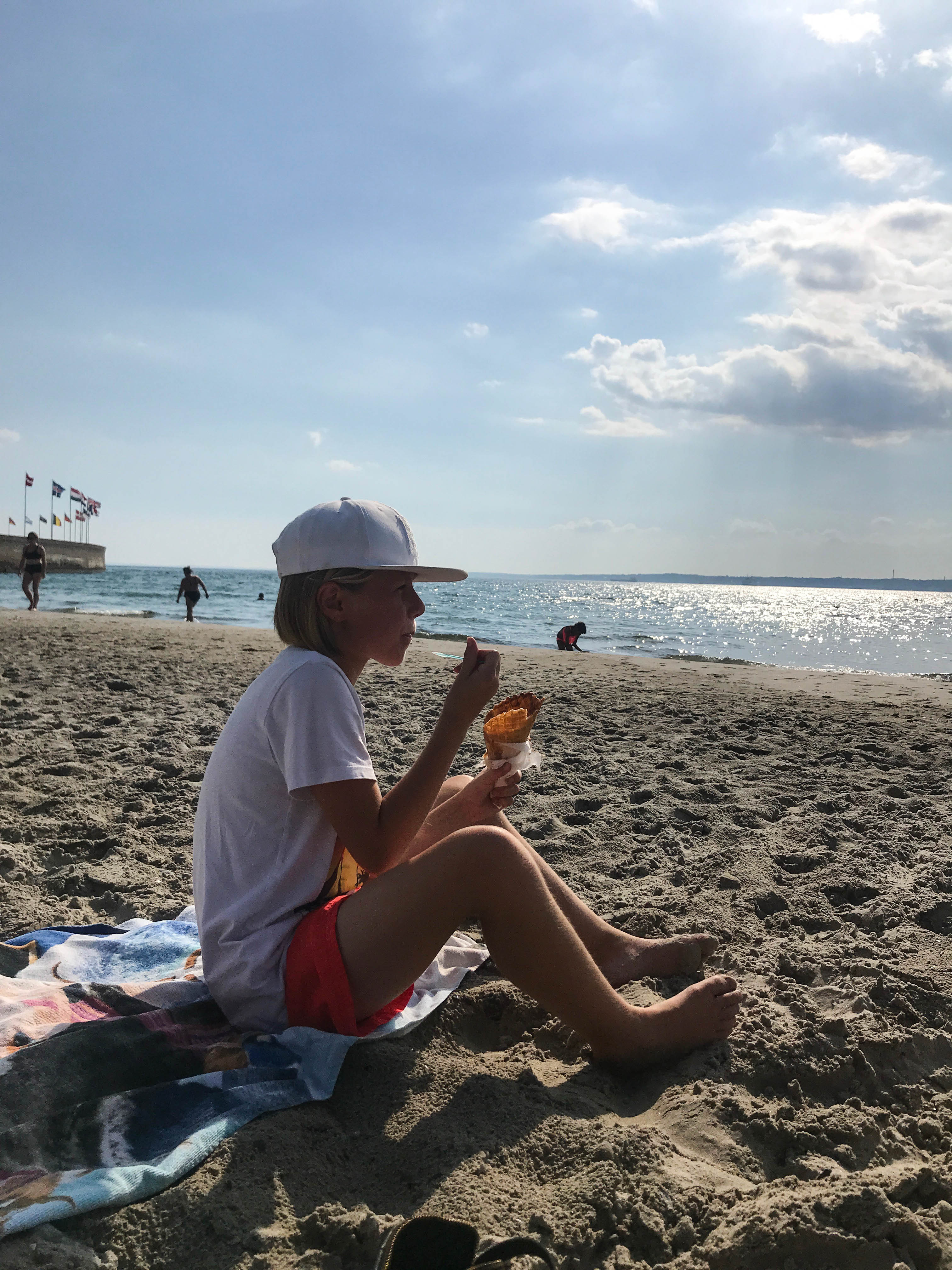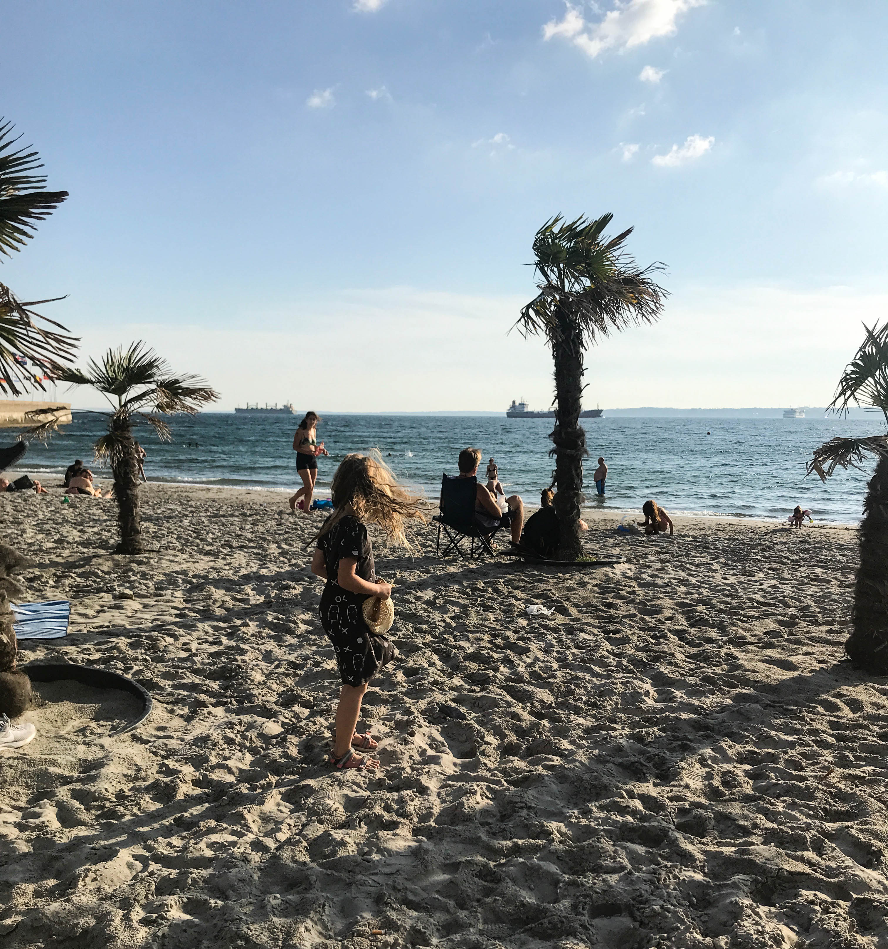 ✱ Barn samlar snäckor och badar. Päron sitter i strandbaren med fötterna i sanden (och stort obs på att barn bara får bada i grunt vatten och så att vi ser dem)