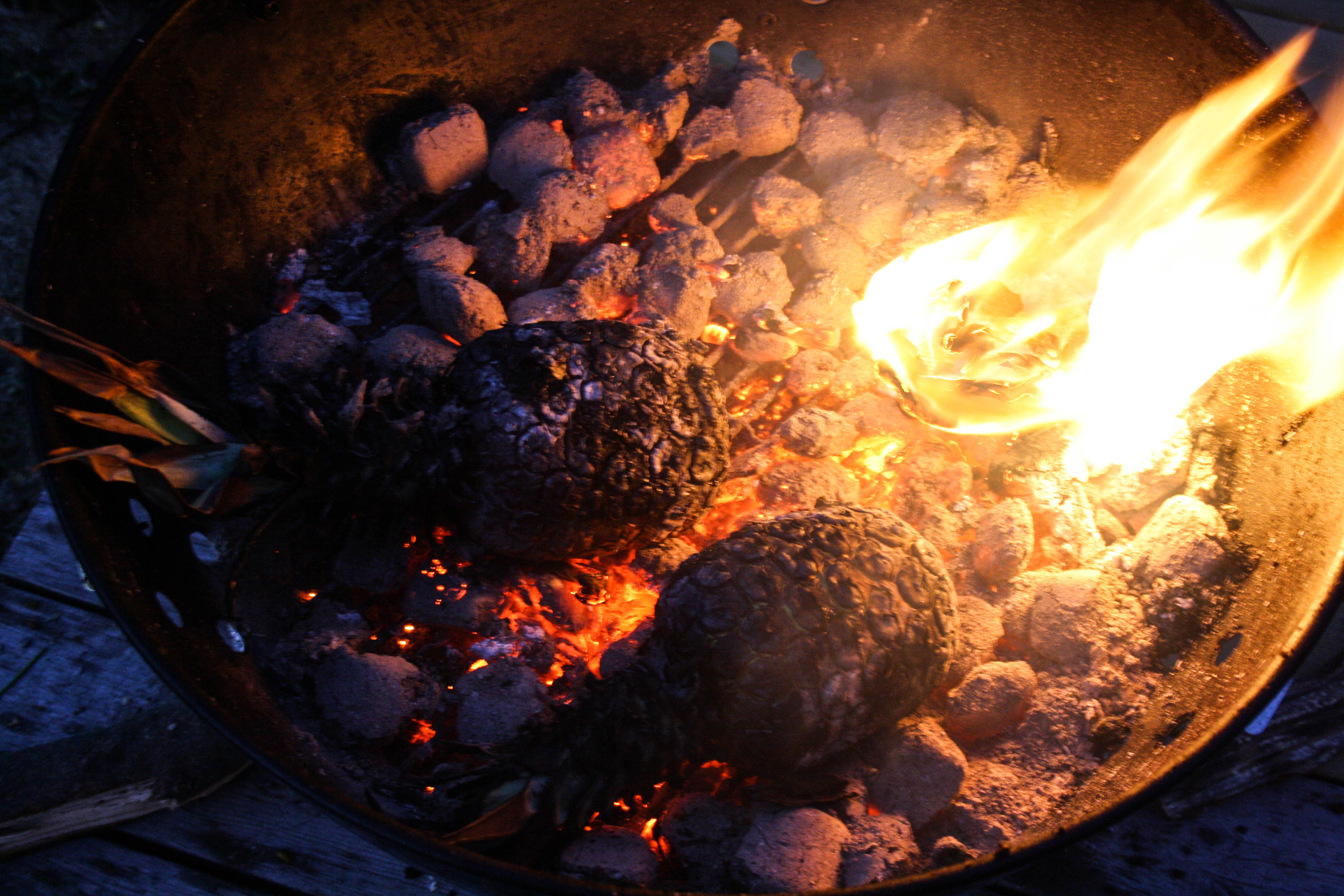 Lägg ananasen (med skal) på den glödande kolen. Baka ca 30 minuter tills den mjuknar. Vänd då och då. Låt svalna lite innan den skärs upp i bitar/skivor.