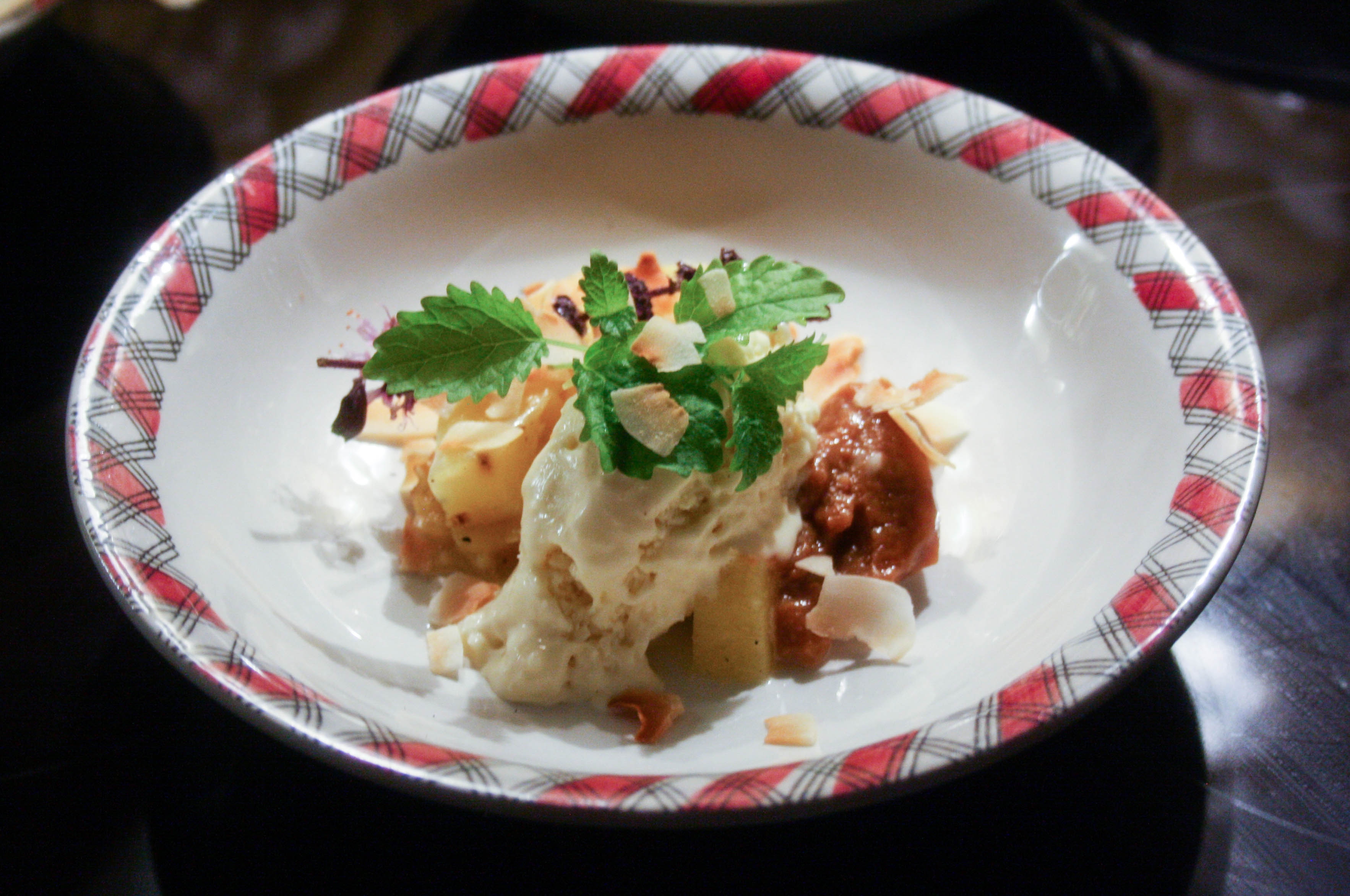 Här kommer i alla fall en GRYM dessert. Hemmagjord kokosglass med grillad ananas, en klick dulche de leche och rostad mandel. Visserligen var jag salongs på både gott vin och vacker sommarnatt men majgadd så gott!