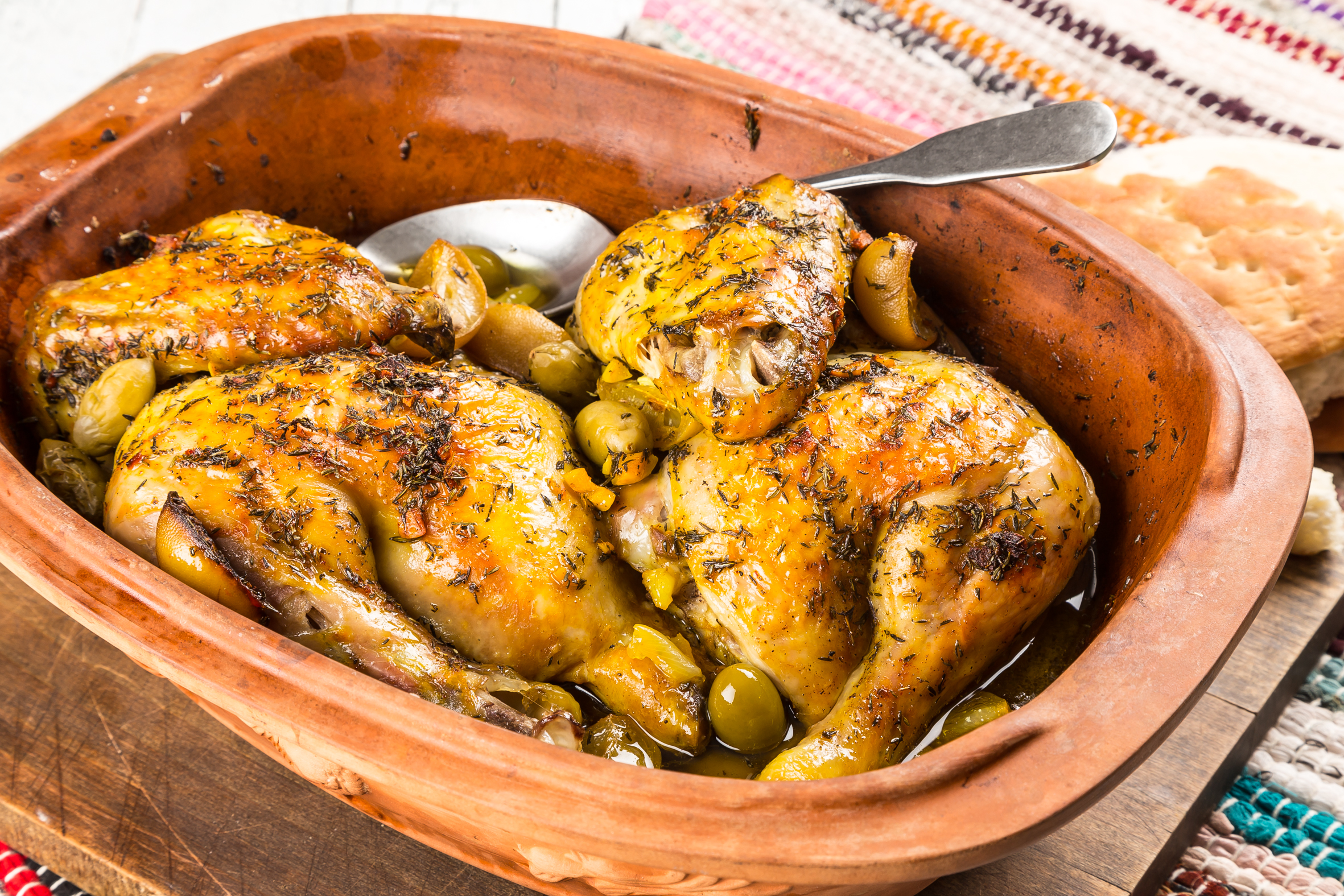 Skölj, dela och torka av kycklingen och lägg ner i lergrytan. Tillsätt oliver och citroner i klyftor.