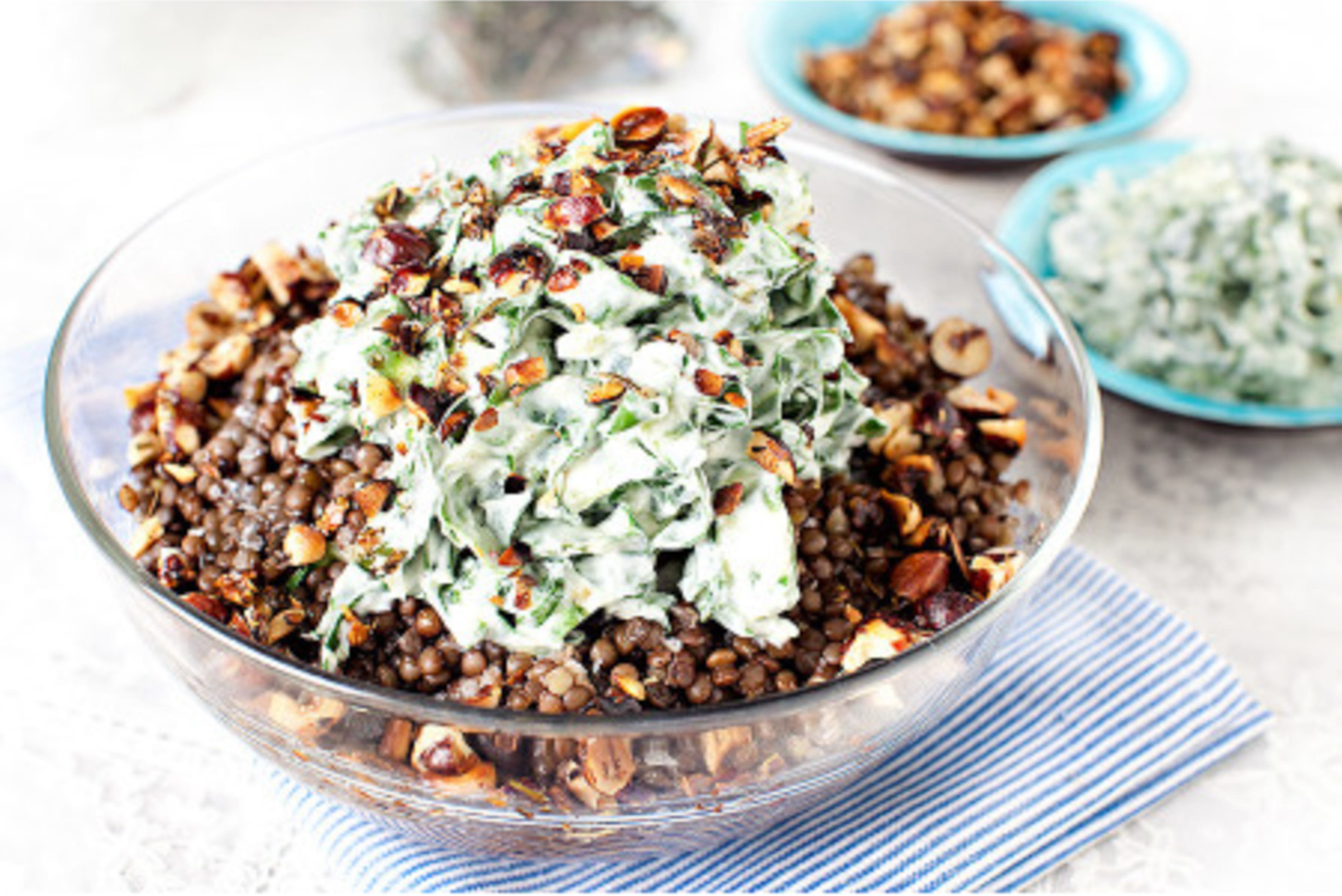 Här en bra linssallad med nötter som kan serveras i en wrap, som sidosallad till soppa, omelett eller tillsammans med en grönsallad och en bit bröd.