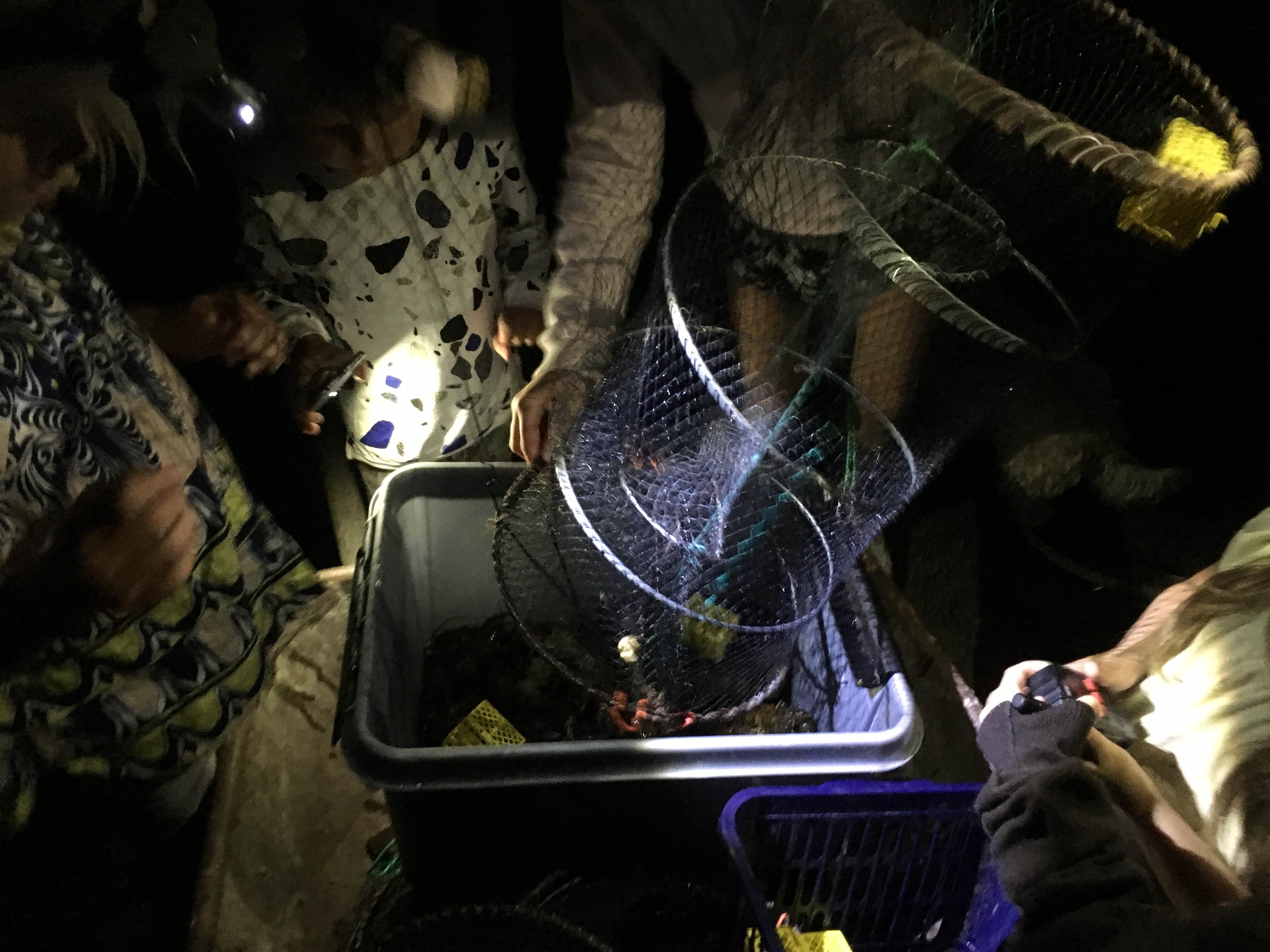 Nu granskar man sin fångst och alla kräftor som är mindre än 10cm (från huvud till stjärt) åker tillbaka i vattnet.