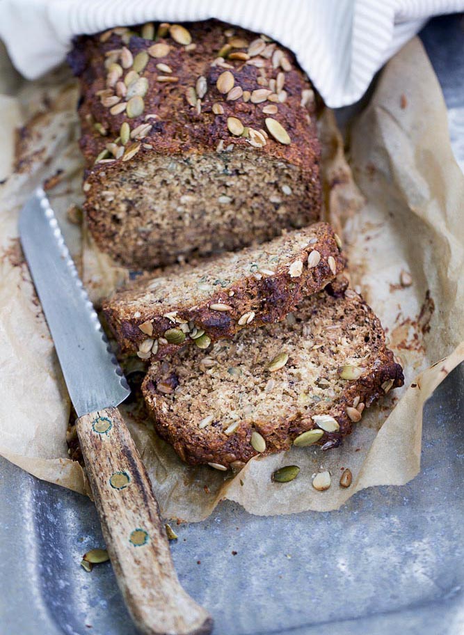 Bananbröd som bakas i form och därmed extra snäll på att ta emot lite av varje, hur mycket frön eller vilka mjölsorter som finns hemma.