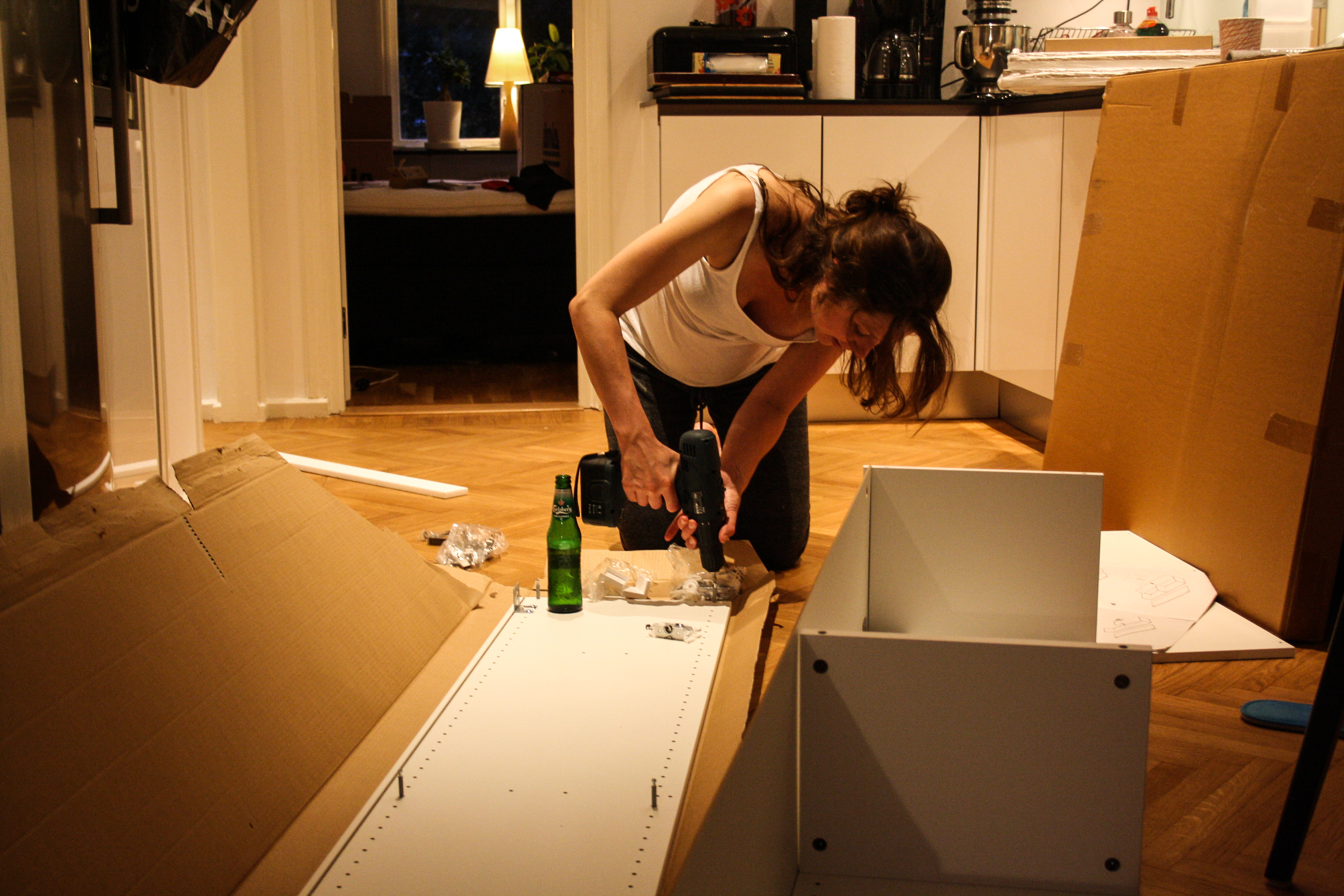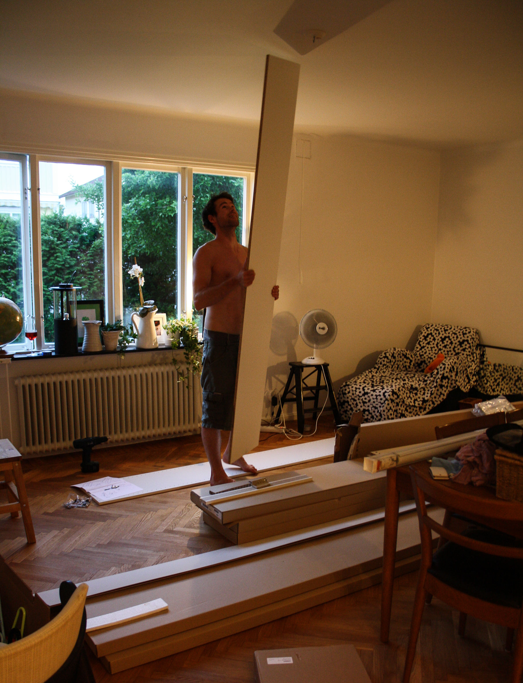Lägger med en av favoritbilderna när vi flyttade från vår förra lägenhet. Tv:n vägde bly, och stegen är uppbackad av kokböcker i trappan.