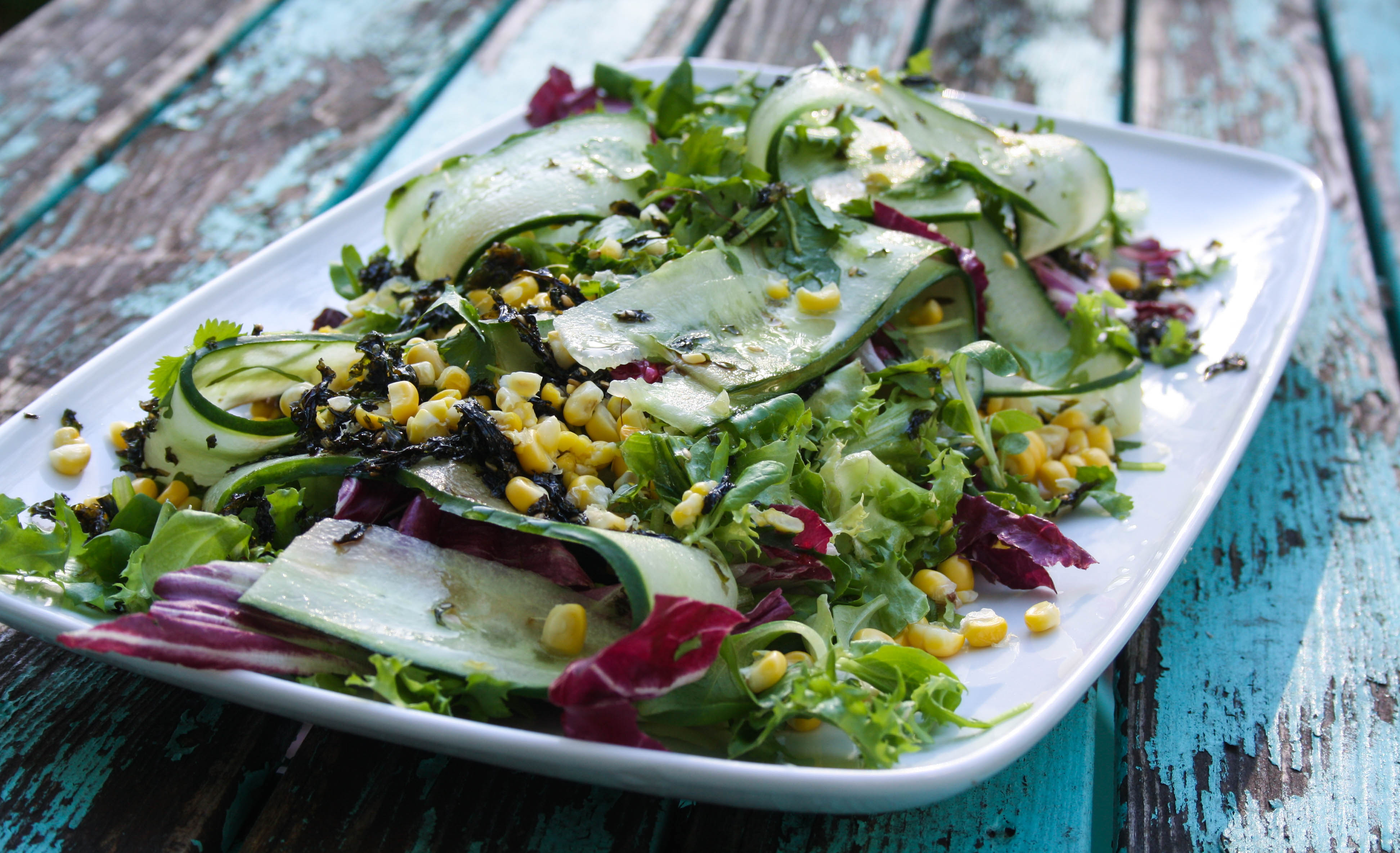 Blanda samman allt med sesamolja, salt och peppar. Skär av majkorn från kolven och blanda ner i salladen.