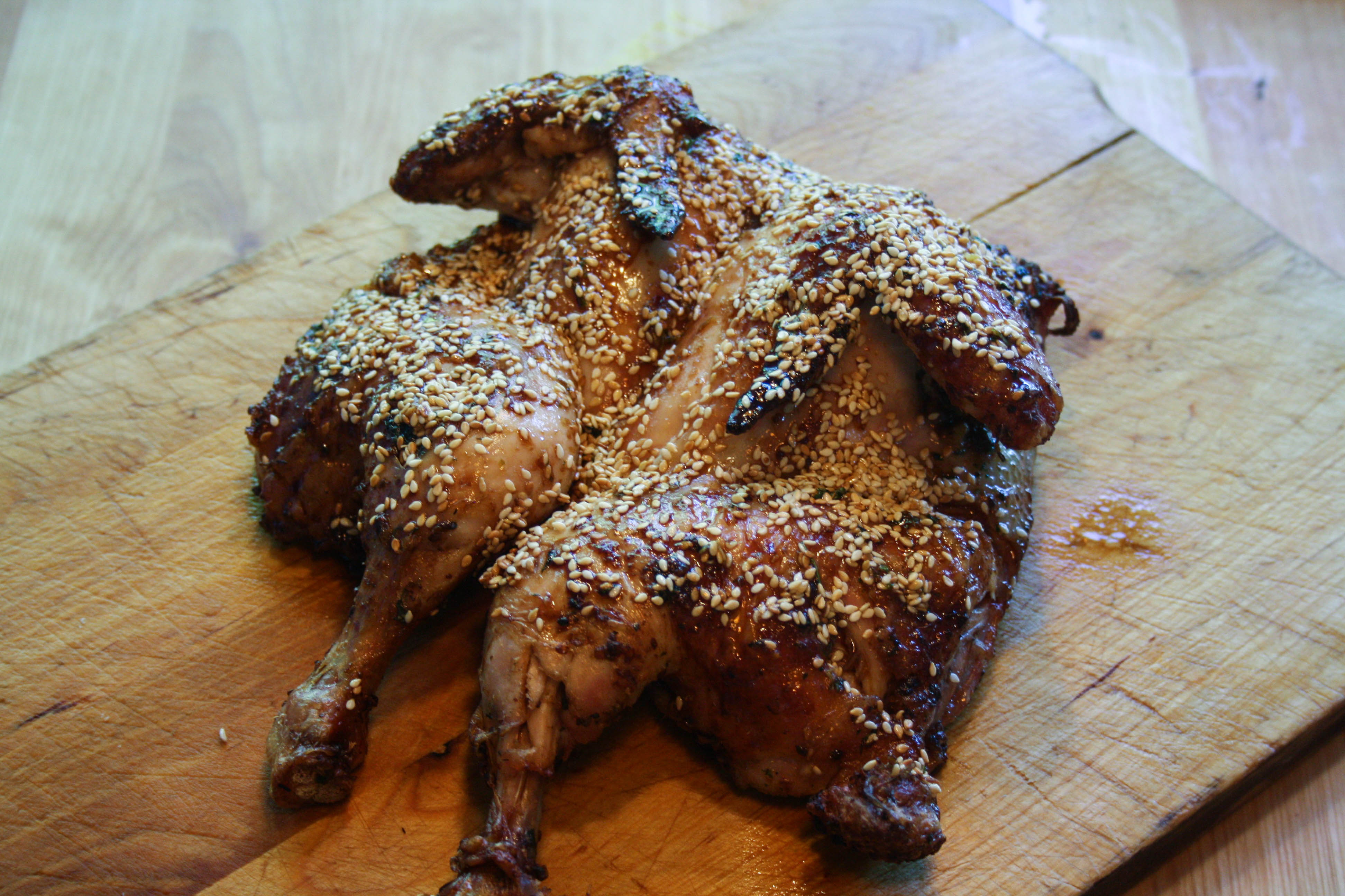 Grilla kycklingen, först i ca 20 minuter med bensidan mot grillen och med locket på, vänd sedan och grilla ytterligare 10-20 minuter med skinnsidan ner. Pensla på mer av marinaden och strö på sesamfrön under grillningen.