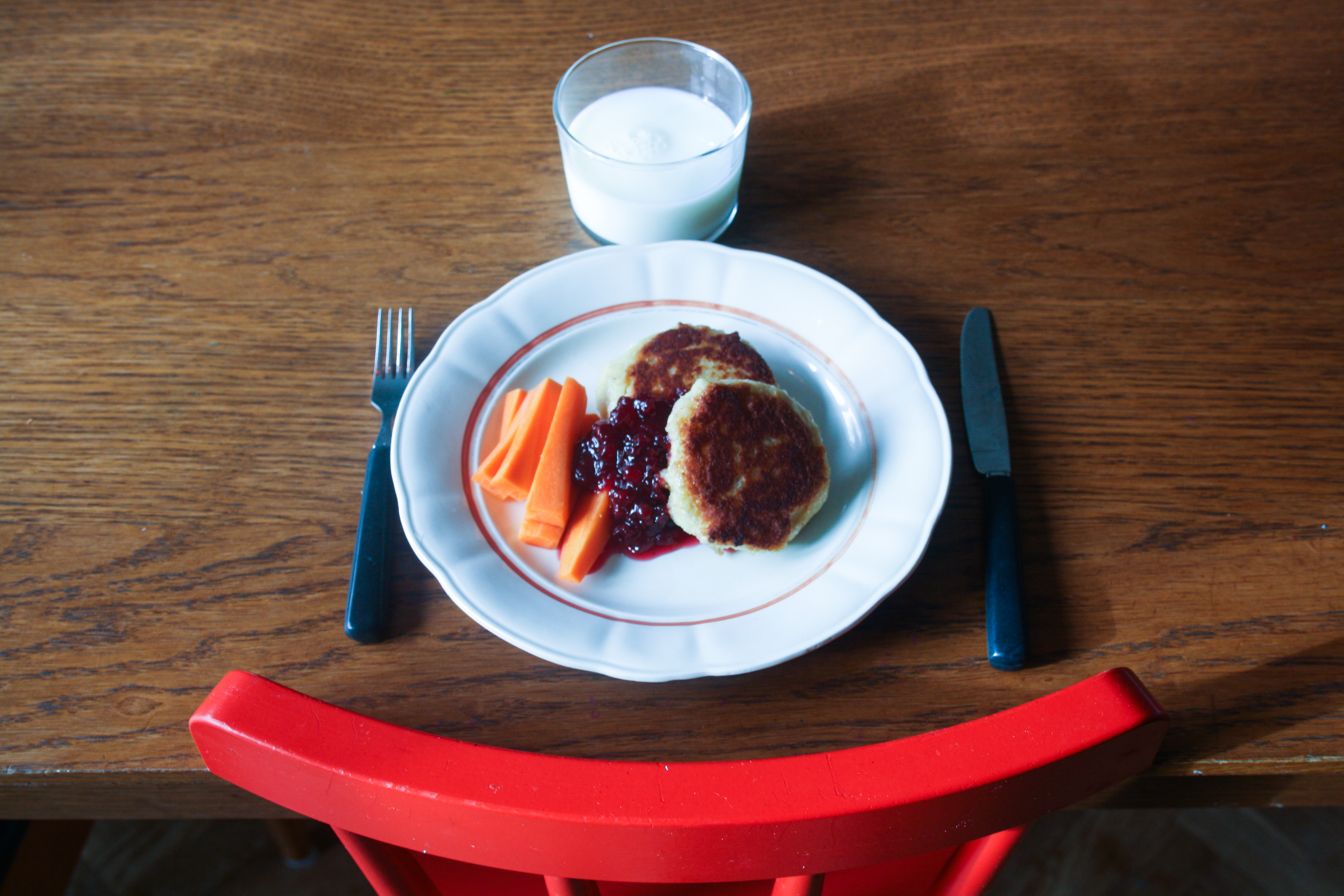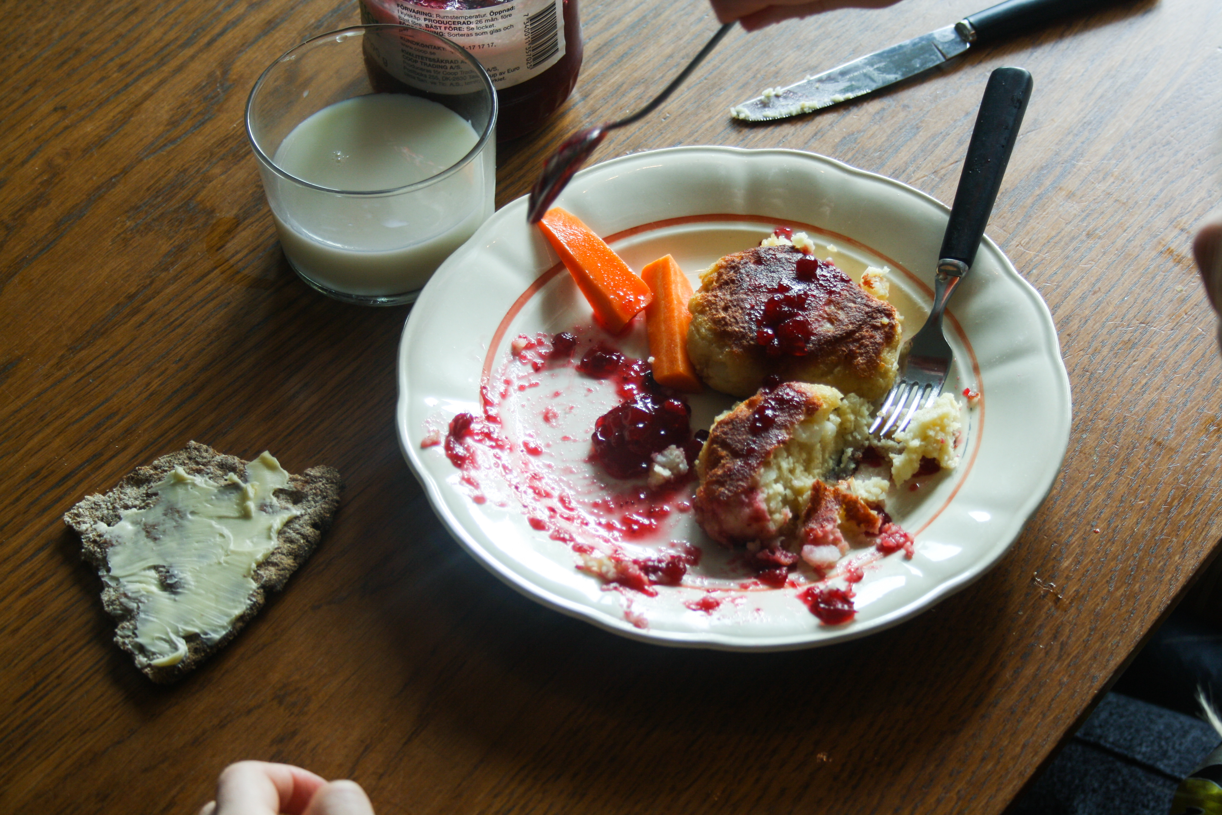 Potatisbullar med lingonsylt, råkost och ett glas mjölk. Hade lika gärna kunnat vara min mormor Gerda eller mamma Gunilla som serverade detta. Så mycket nostalgi där i vår tidiga lunchstund. Både P4 och förkläde var på under hela lunchen. Och riktigt bra Potatisbullar. Trodde jag. Men njae.