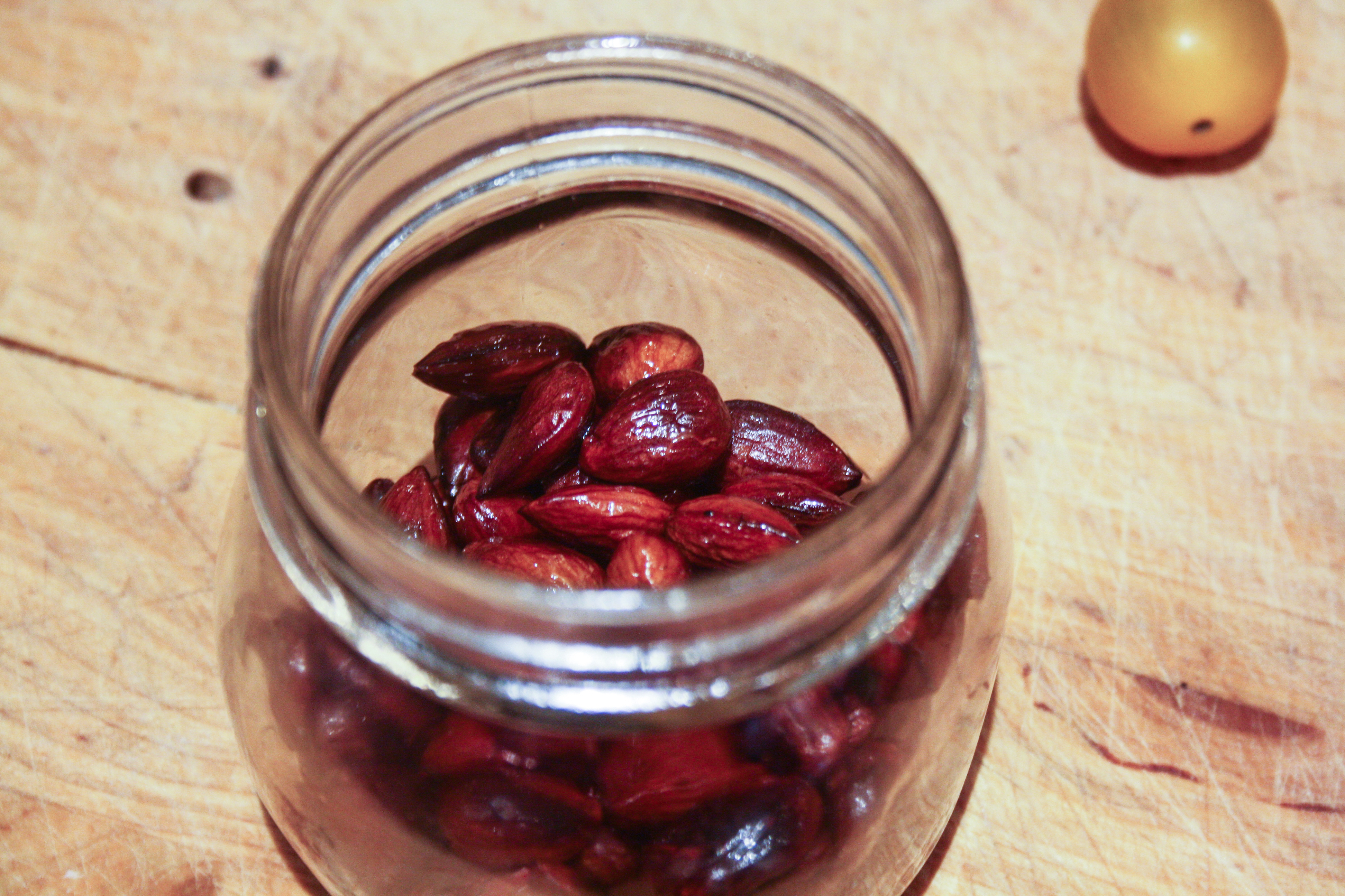 Rosta mandlarna i en het panna. Antingen torrostar ni, eller som här med lite olja. Rör runt hela tiden så att de inte bränner. Dra av från plattan och strö över flingsalt.