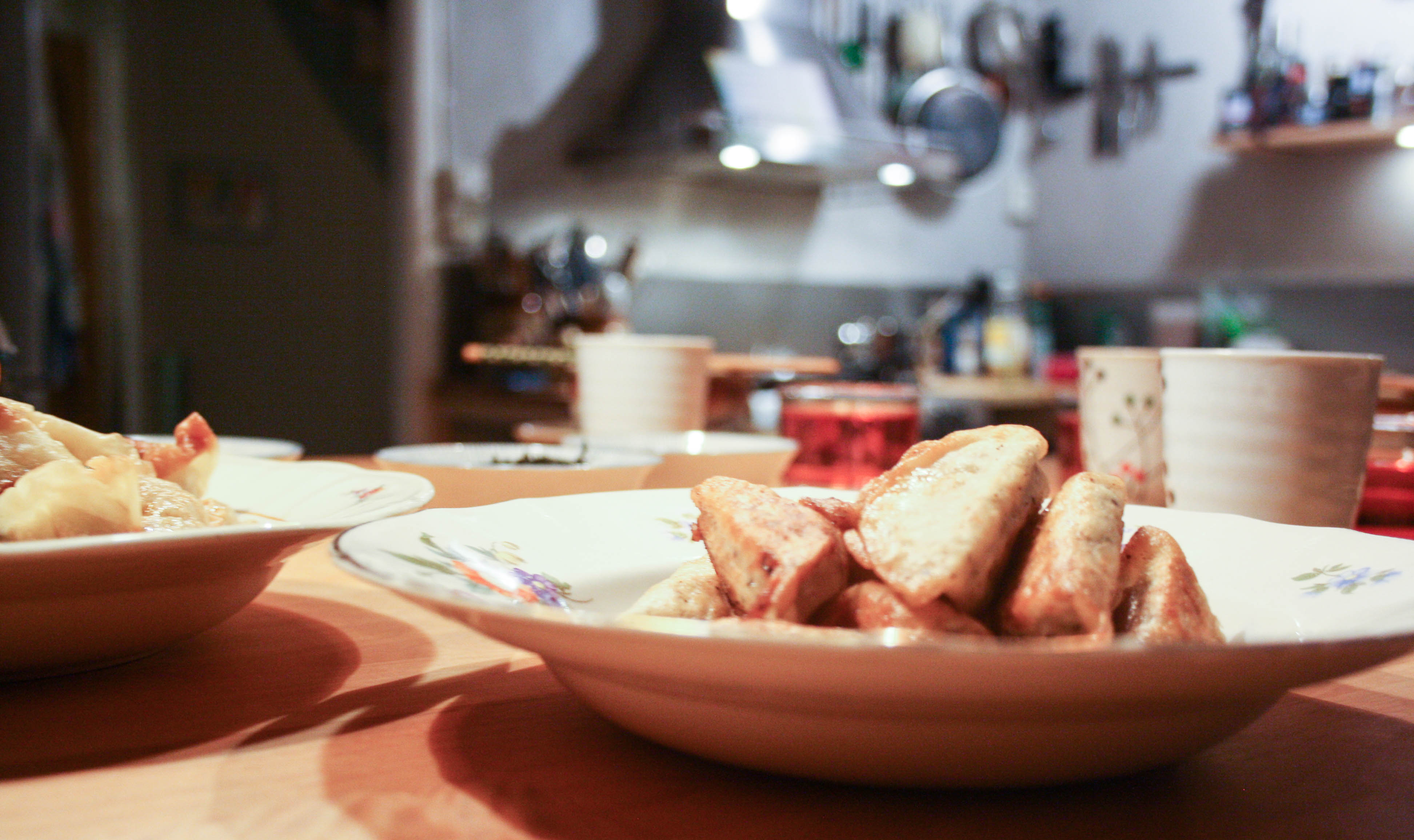 - Svamp, vitlök, riven ingefära, chili och pakchoi fräst i sesam- och matolja.