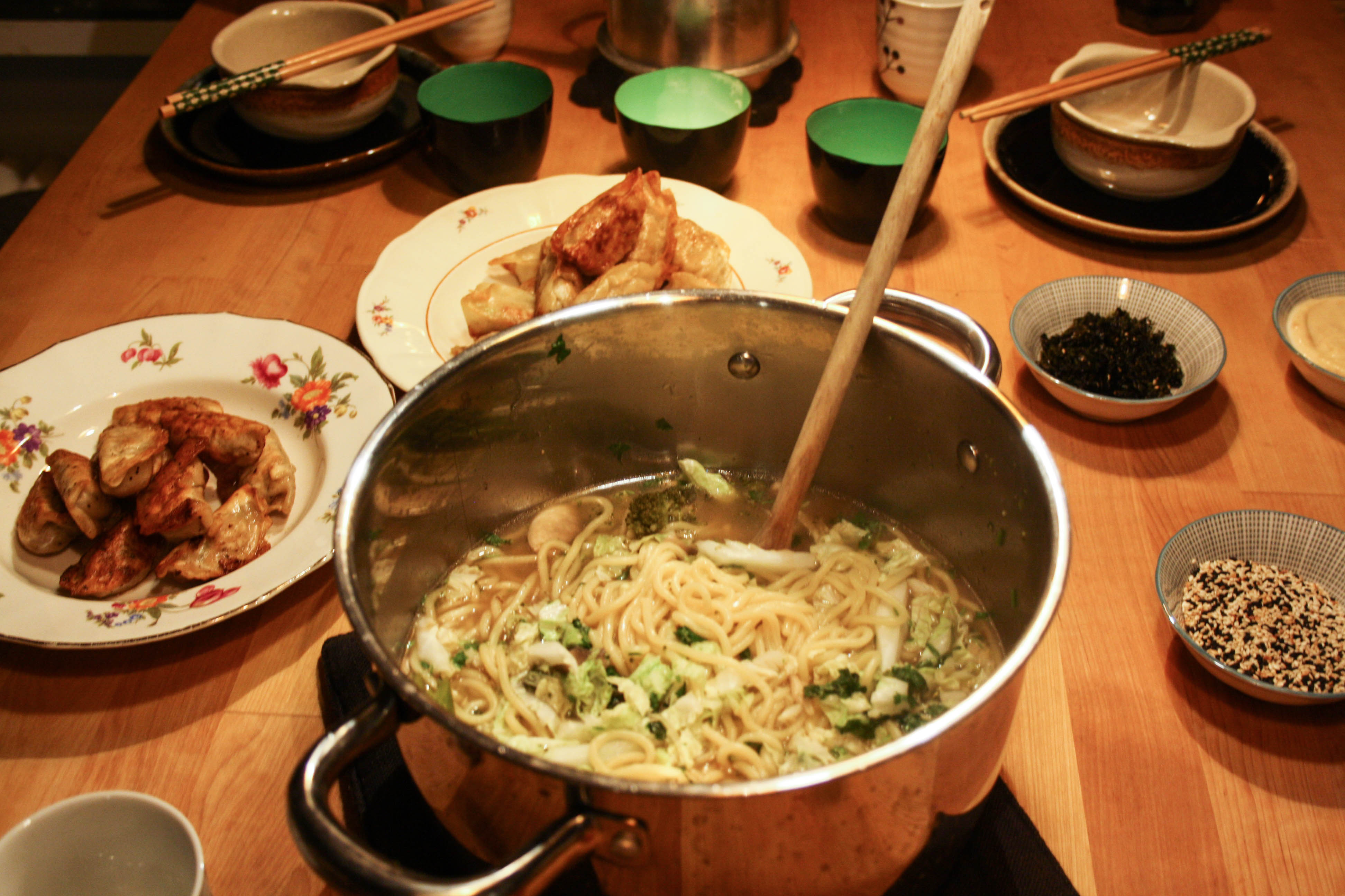- Lägg upp nudlar, grönsaker och slå över buljongen. Serverades här med dumplings, grönt te, rostade sesamfrön, torkade alger som smulas över.
