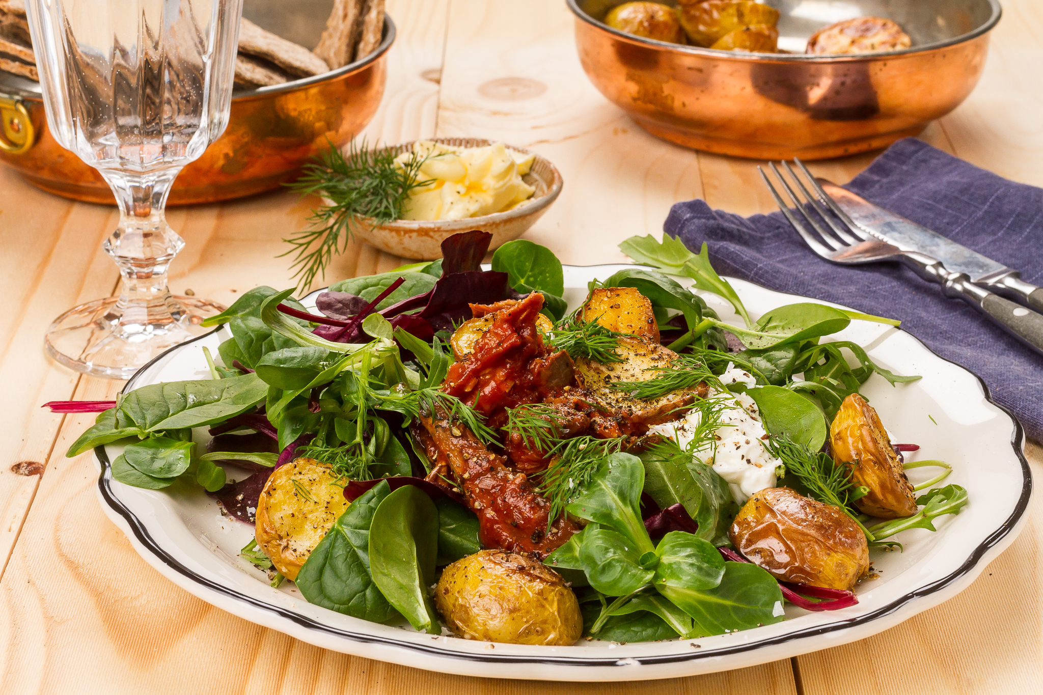 Blanda samman olja, hackad dill, citron, salt och peppar. Blanda samman med salladen. Lägg upp sallad, potatis, makrill och en klick gräddfil.