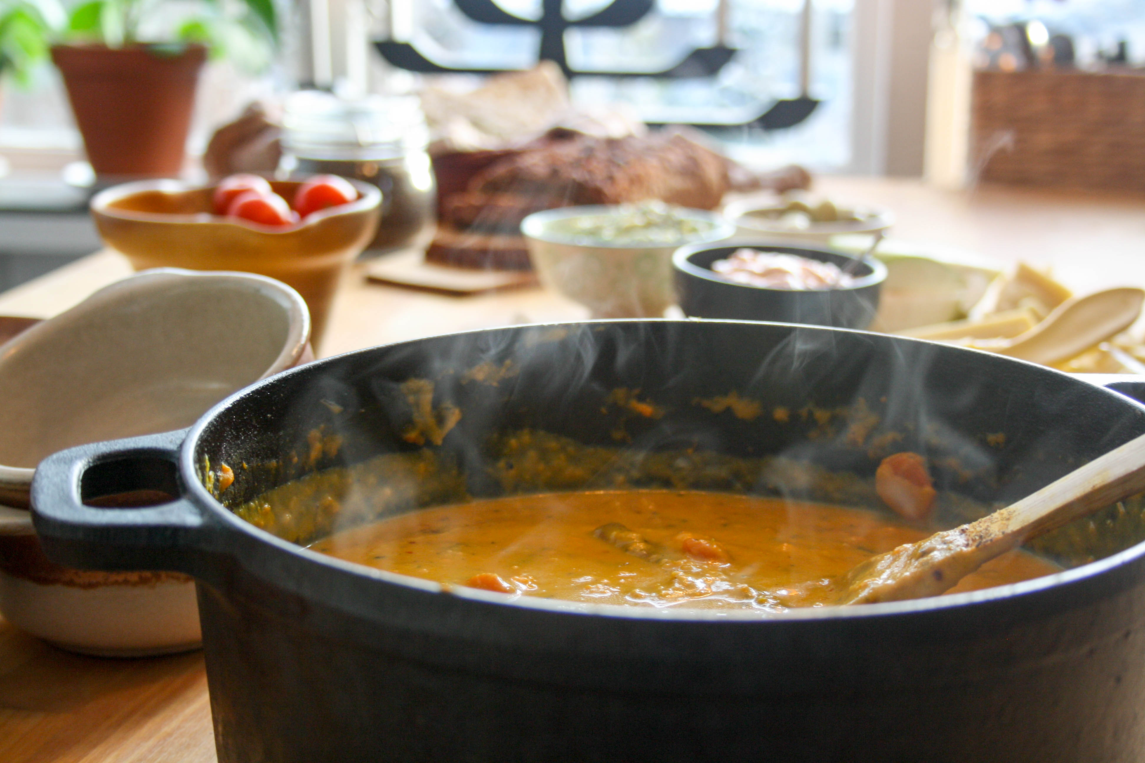 Ha sen i resterande ingredienser och låt allt puttra under lock i 30 minuter. Tillsätt mer vätska om den känns för tjock och låt puttra utan lock om den känns för tunn.