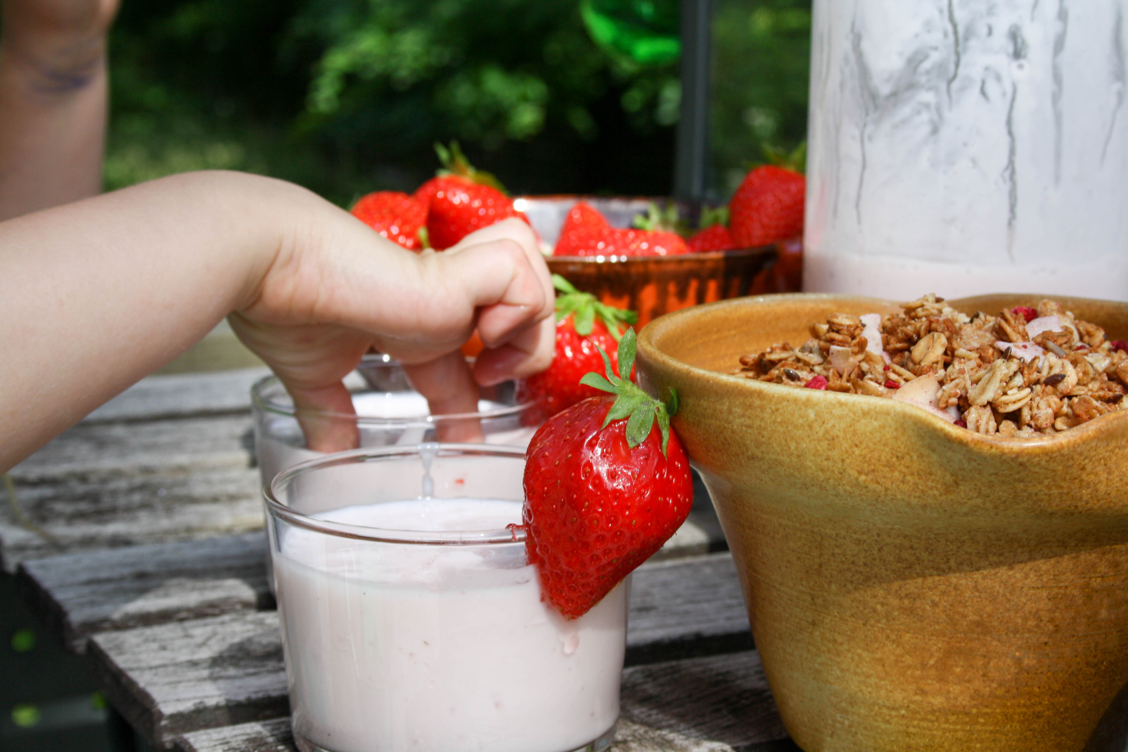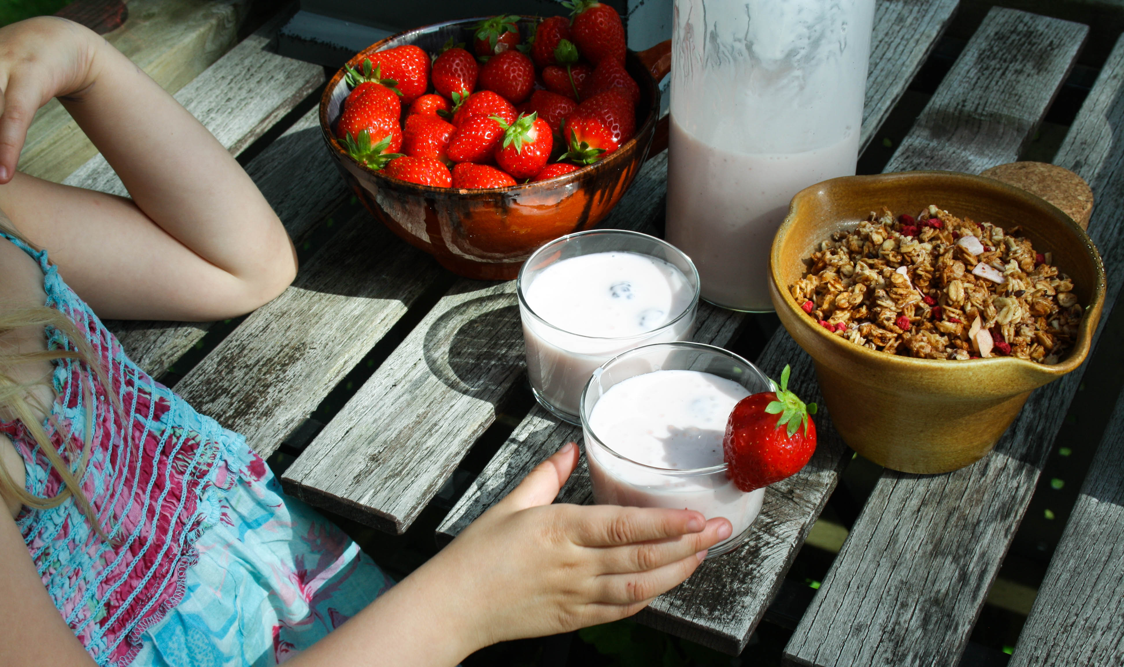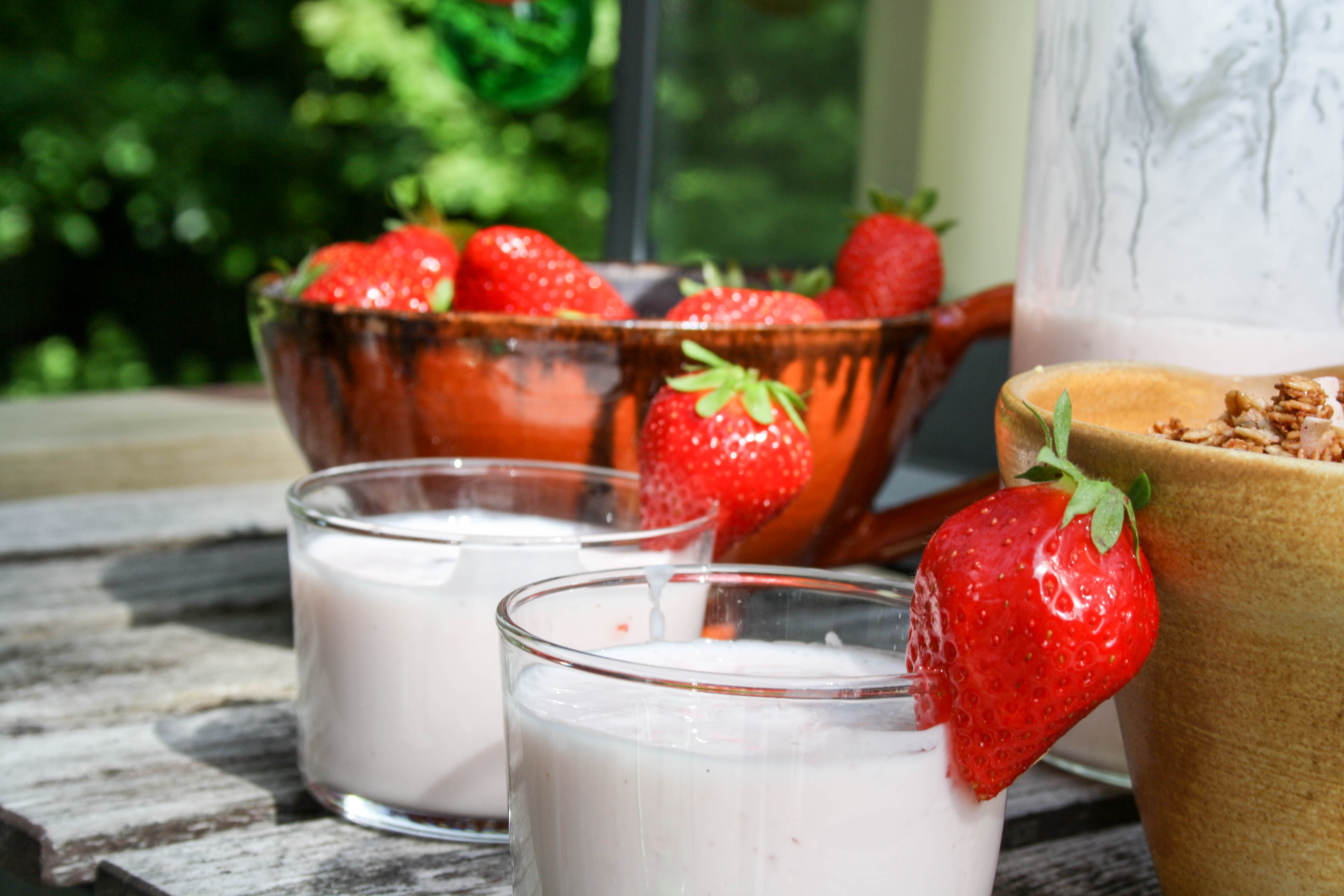 Drickyoghurt är inget konstigare än yoghurt/fil + mjölk/vatten + lite saft eller färska bär. Vill man så kan man såklart mixa ner lite av varje från både skafferi och bärbuskar.