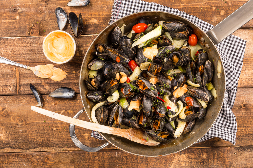 Tips: Vill man så kan man sila av musslorna och skumma upp såsen med en mixerstav. Lägg upp musslorna på tallrikar och häll över den skummade såsen.