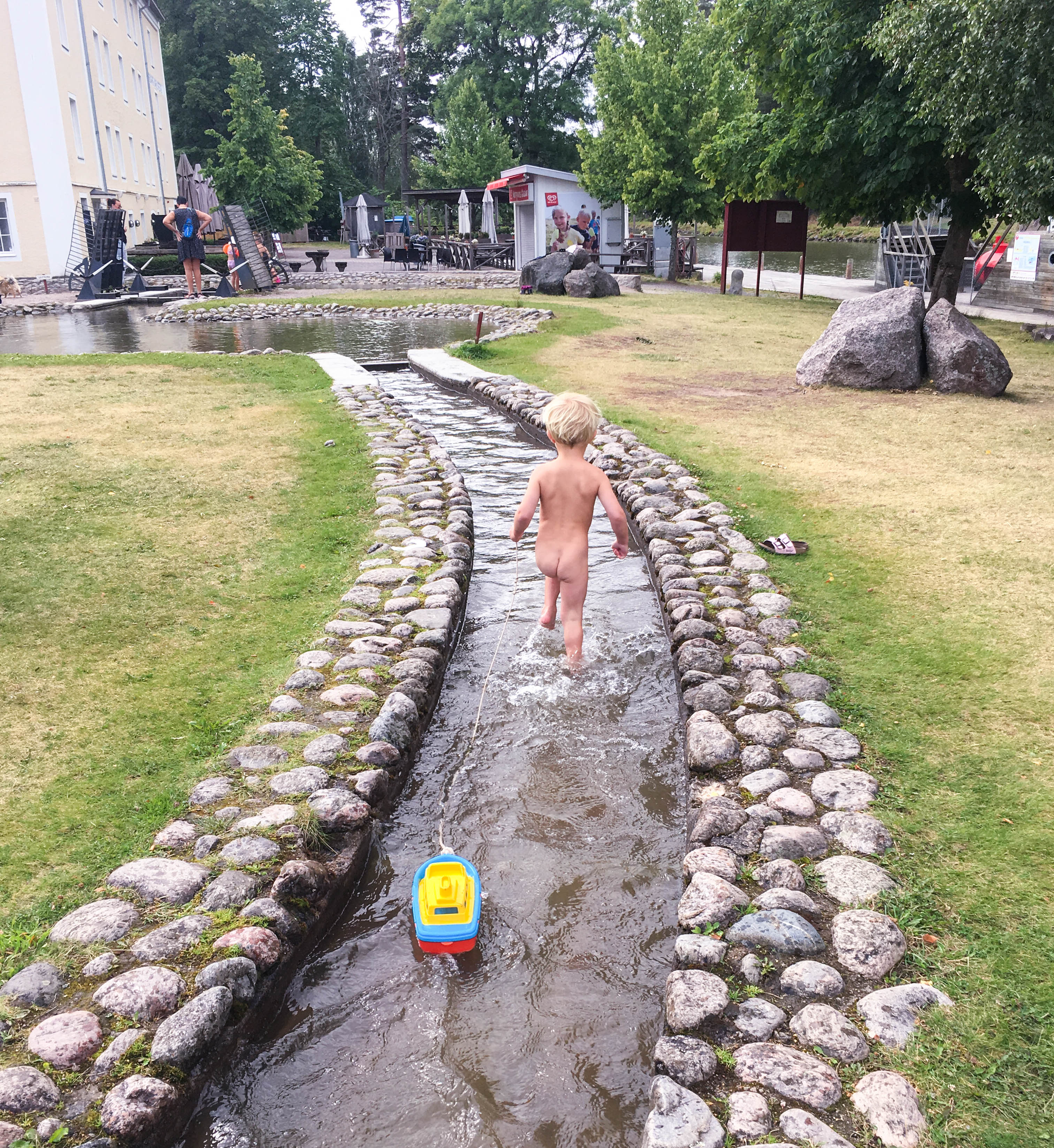 De har även byggt upp en minikanalsystem där barnen kan bada och slussa runt sina egna små båtar. Sysselsätter dem imponerade länge till de vuxnas belåtenhet.