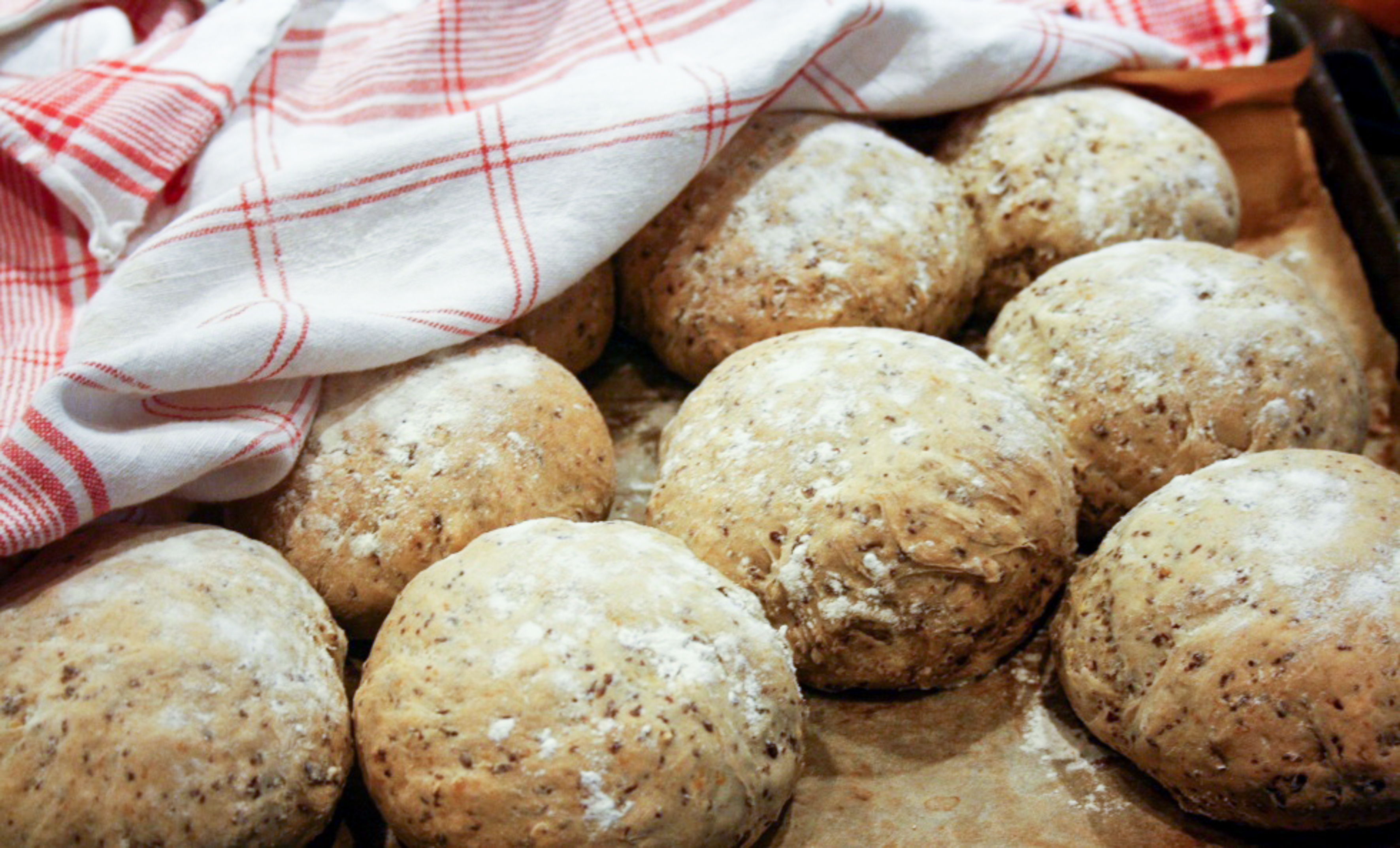 - Kör några varv med degblandaren, stjälp upp degen på mjölat bakbord. Forma till bullar och låt jäsa under duk i 30 minuter till.