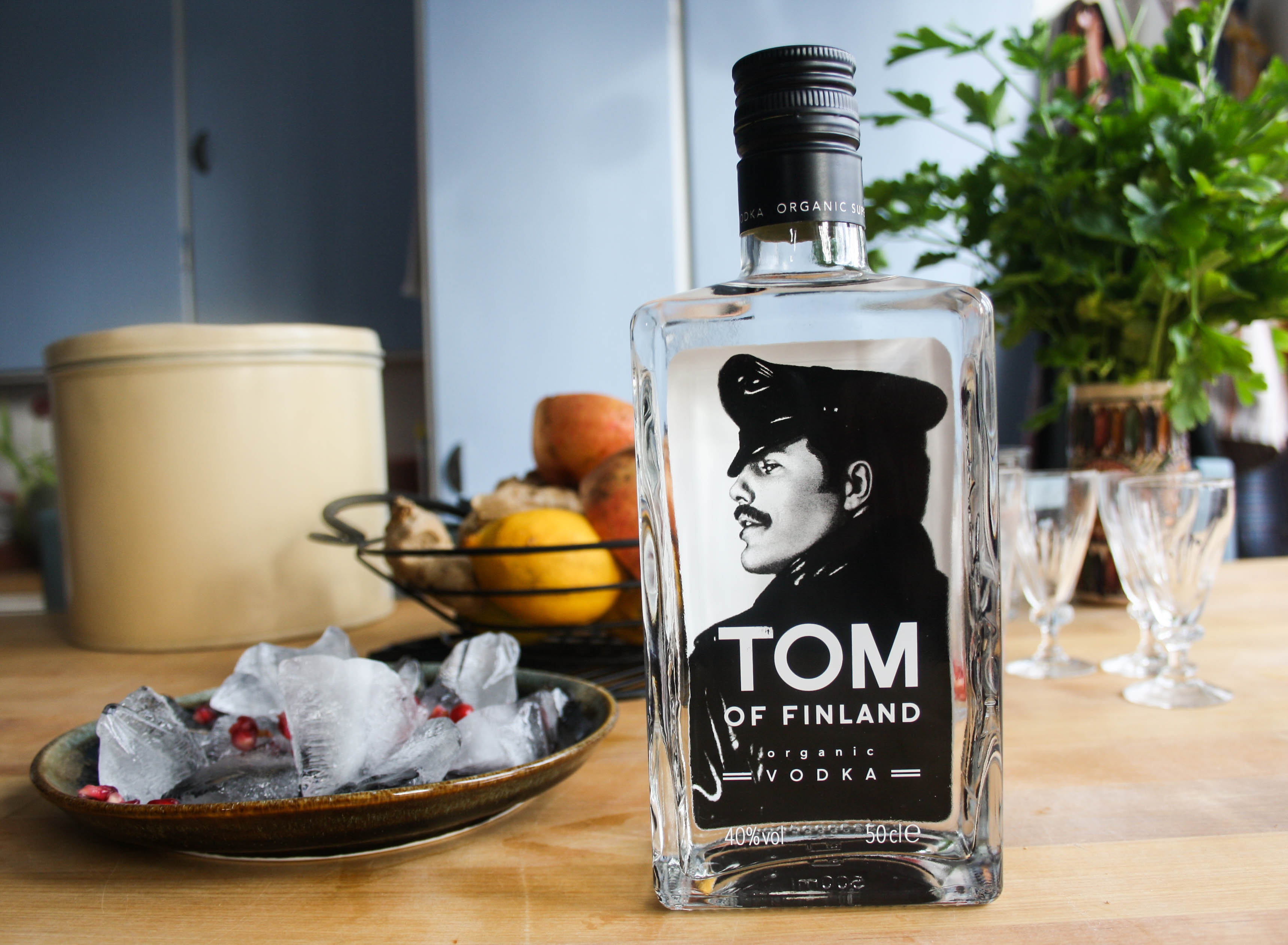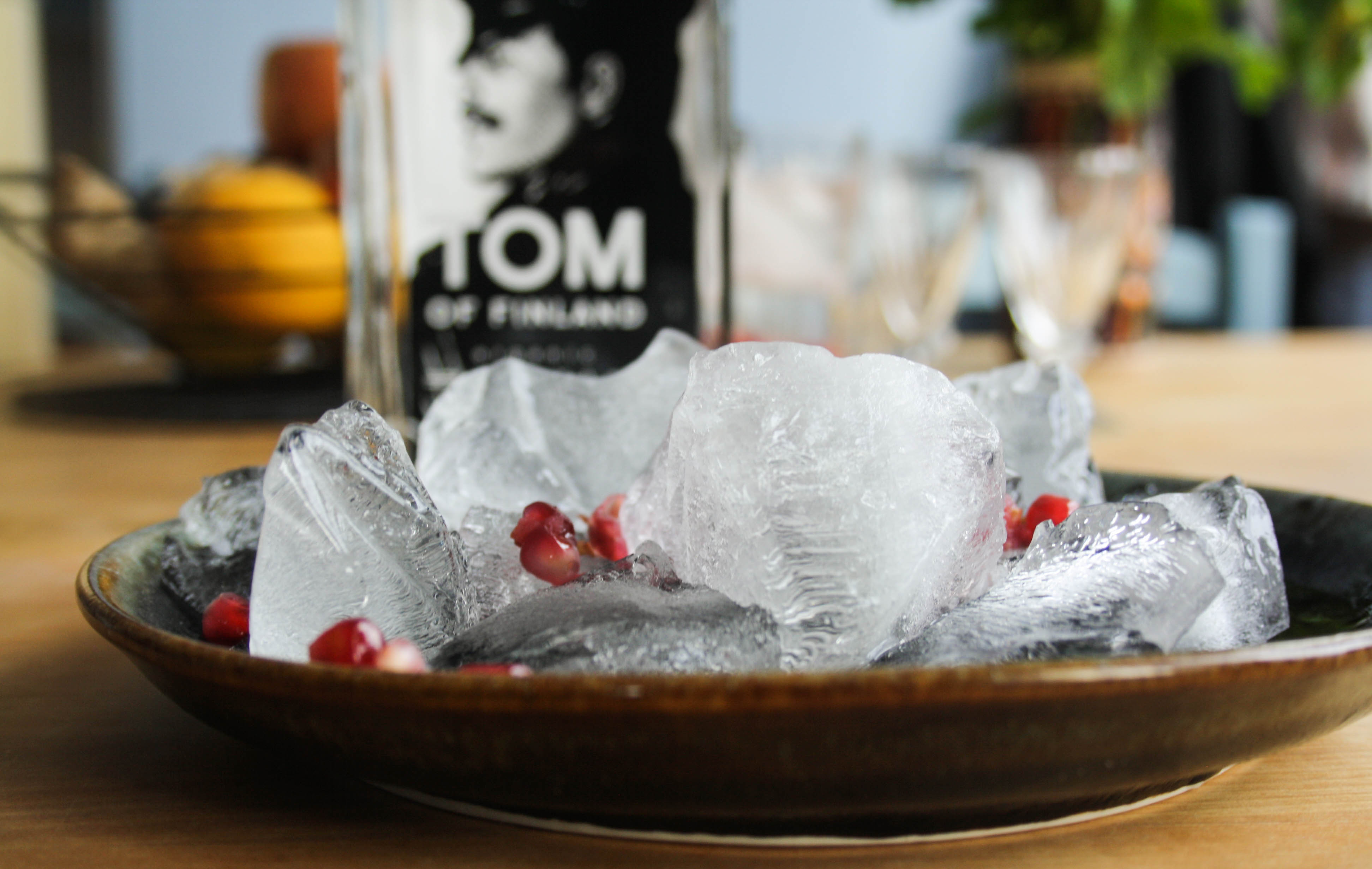 En fin flaska vin, blommor, choklad – alla bra gåbort presenter. Neutrala, artiga och alltid rätt. Sen är det faktiskt inte dumt med bra sprit. Allra helst i en fin flaska. Gärna tillsammans med ett drinkkoncept som här – Tom of Finland, snygg is och granatäpple.