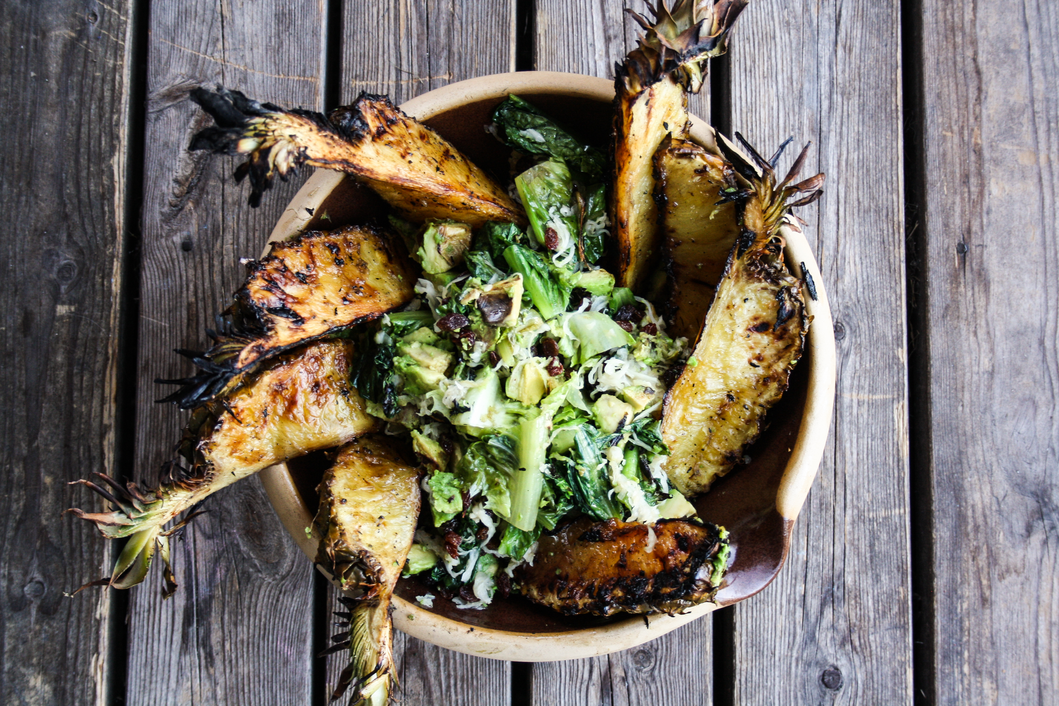 - Grillad sallad. Testa! Här grillades romansallad, annanas, avokado och majs. Sen fick salladen smakskjuts av färsk salladslök, citron, olja, salt och peppar. Blir det för mosigt när man har grillat så är det gott att blanda ut med färsk, krispig sallad så att det blir lite konsistens i den.