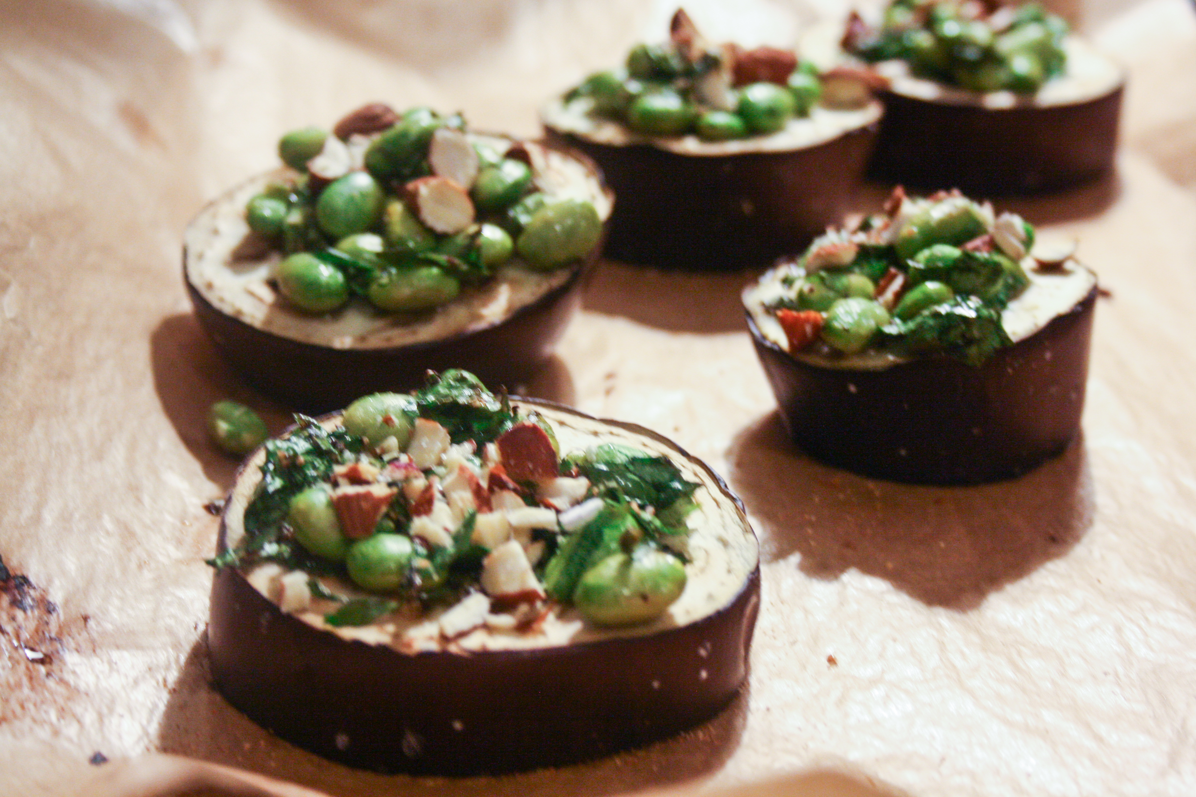Ugnsbakad aubergine med edamame & rostade mandlar (lättare rätt eller sidorätt till 4 pers.)