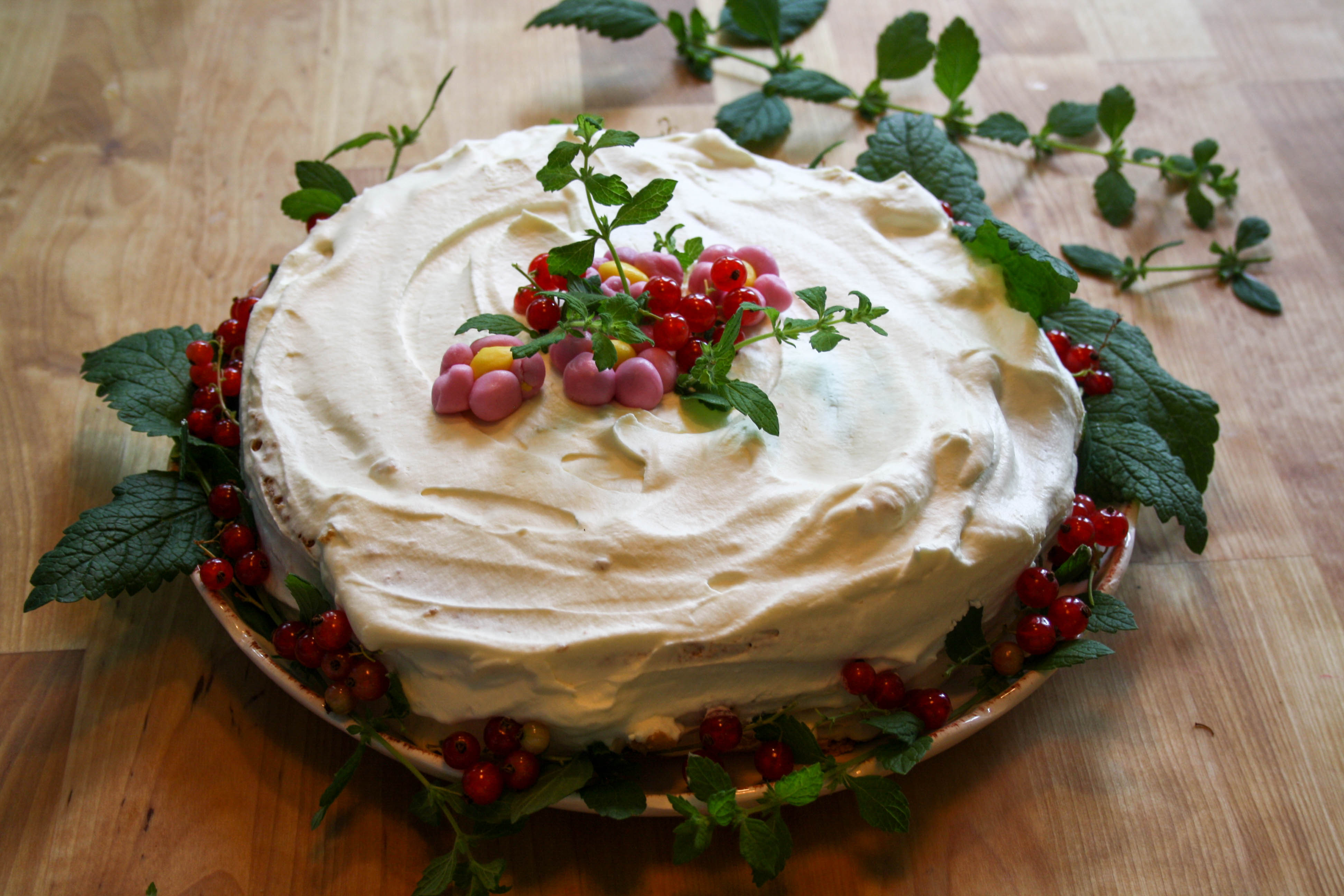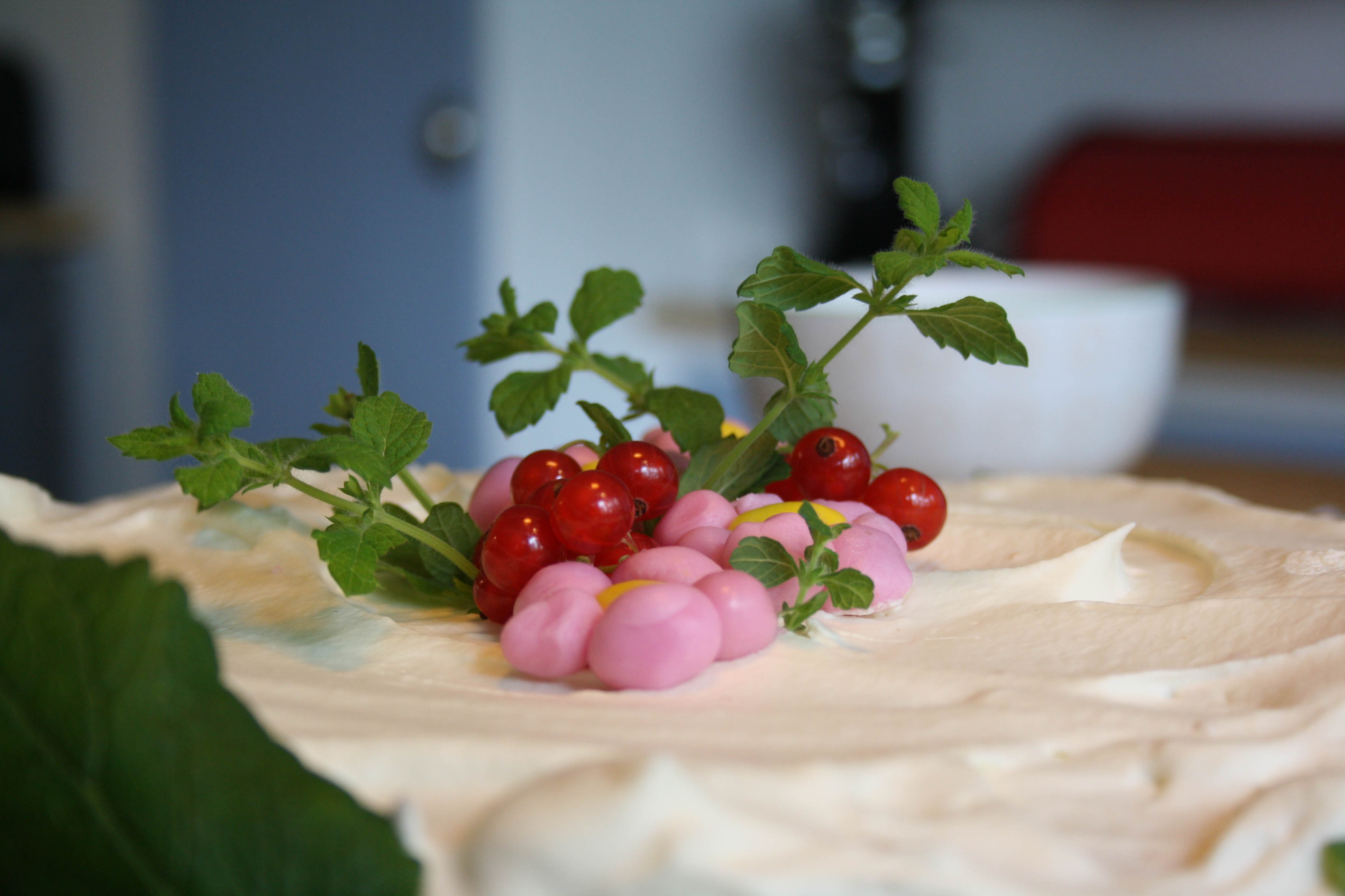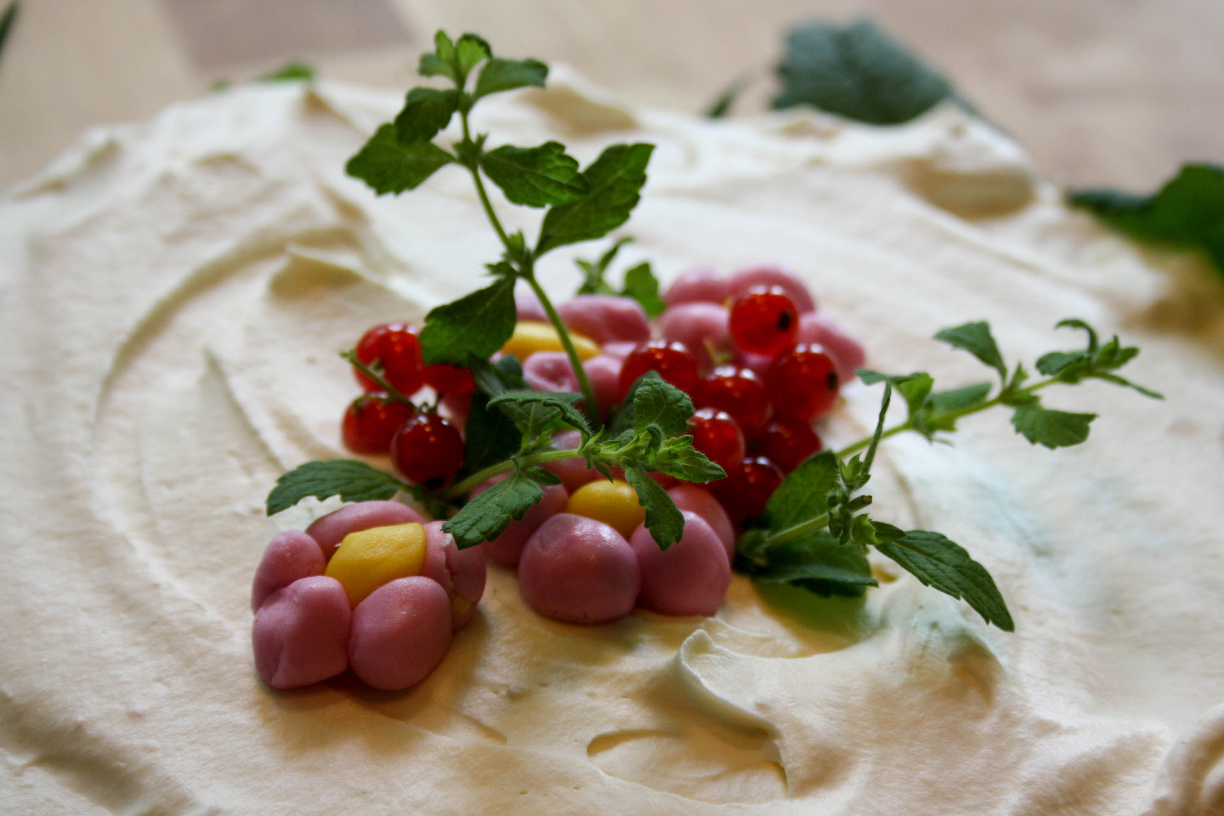 Här breddes vispad grädde utblandat med en klick lemoncurd runt tårtan. Är men inget stort gräddfan så är det gott att blanda hälften grädde och hälften färskost. Dekorerades med sockerpasta, vinbär och citronmeliss.
